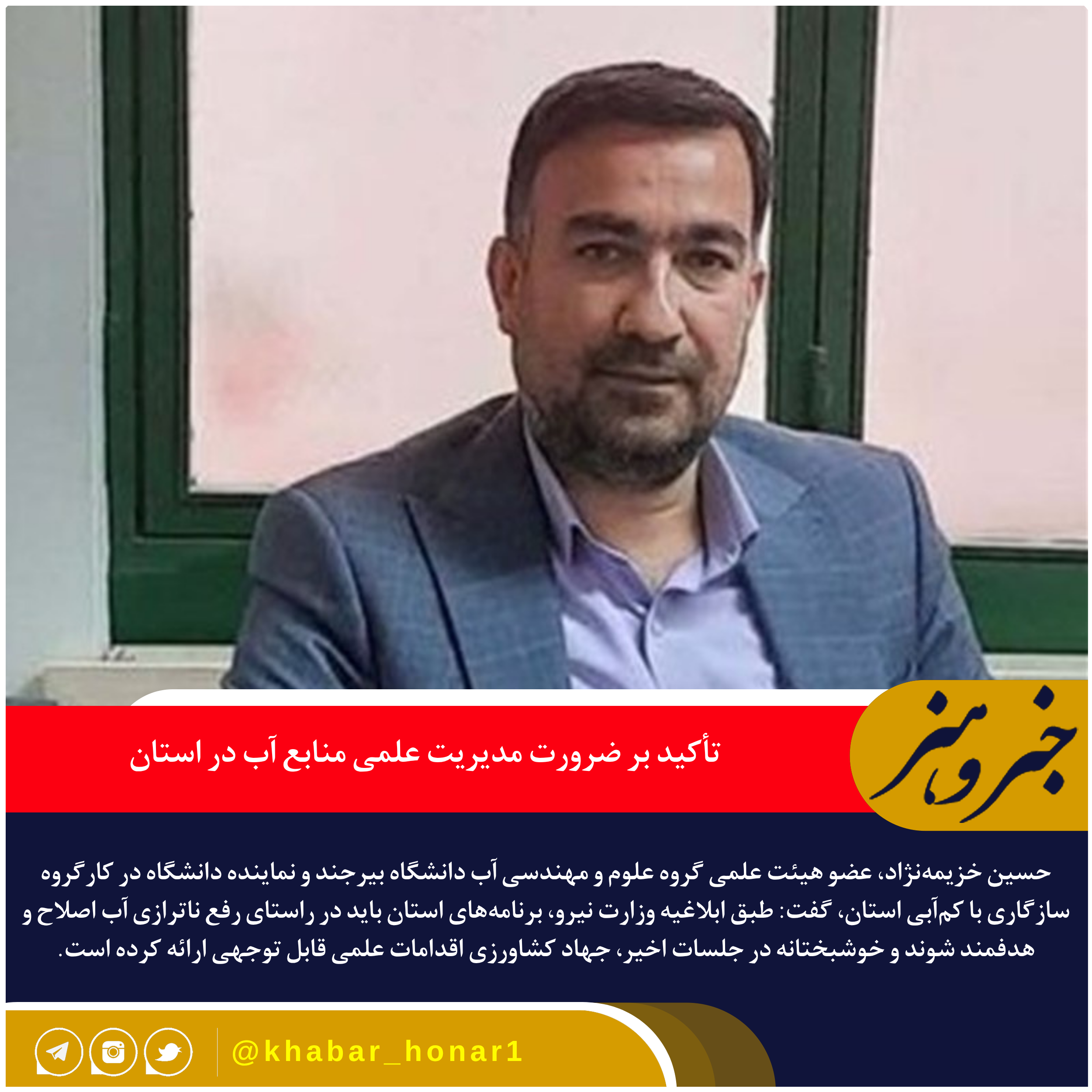 به گزارش خبر و هنر، حسین خزیمهنژاد، عضو هیئت علمی گروه علوم و مهندسی آب دانشگاه بیرجند و نماینده دانشگاه در کارگروه سازگاری با کمآبی استان، گفت: طبق ابلاغیه وزارت نیرو، برنامههای استان باید در راستای رفع ناترازی آب اصلاح و هدفمند شوند و خوشبختانه در جلسات اخیر، جهاد کشاورزی اقدامات علمی قابل توجهی ارائه کرده است.