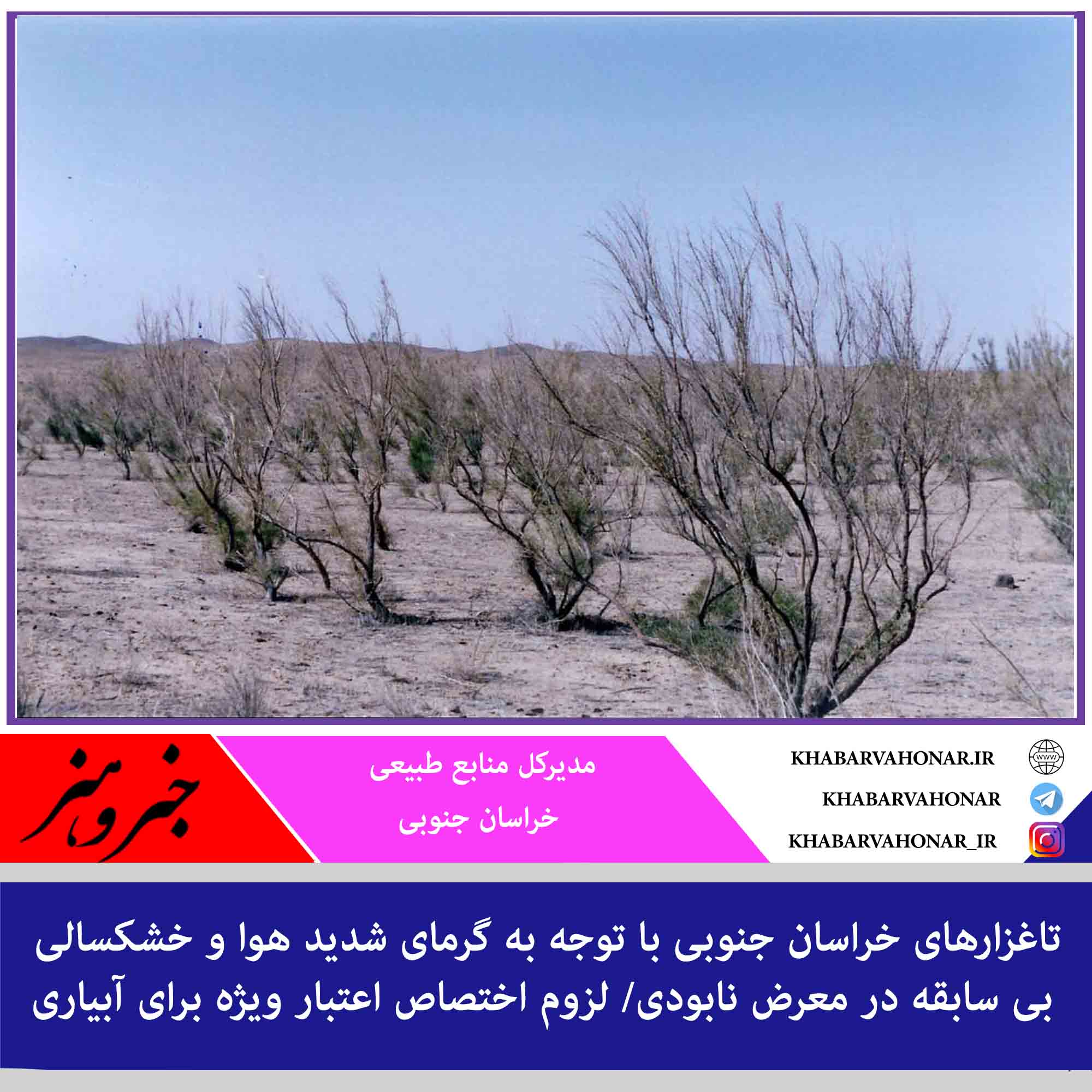 مدیرکل منابع طبیعی خراسان جنوبی با اشاره به گرمای شدید هوا و خشکسالی بی سابقه در استان گفت: نیازمند اعتبار ویژه برای آبیاری تاغزارهای استان هستیم.