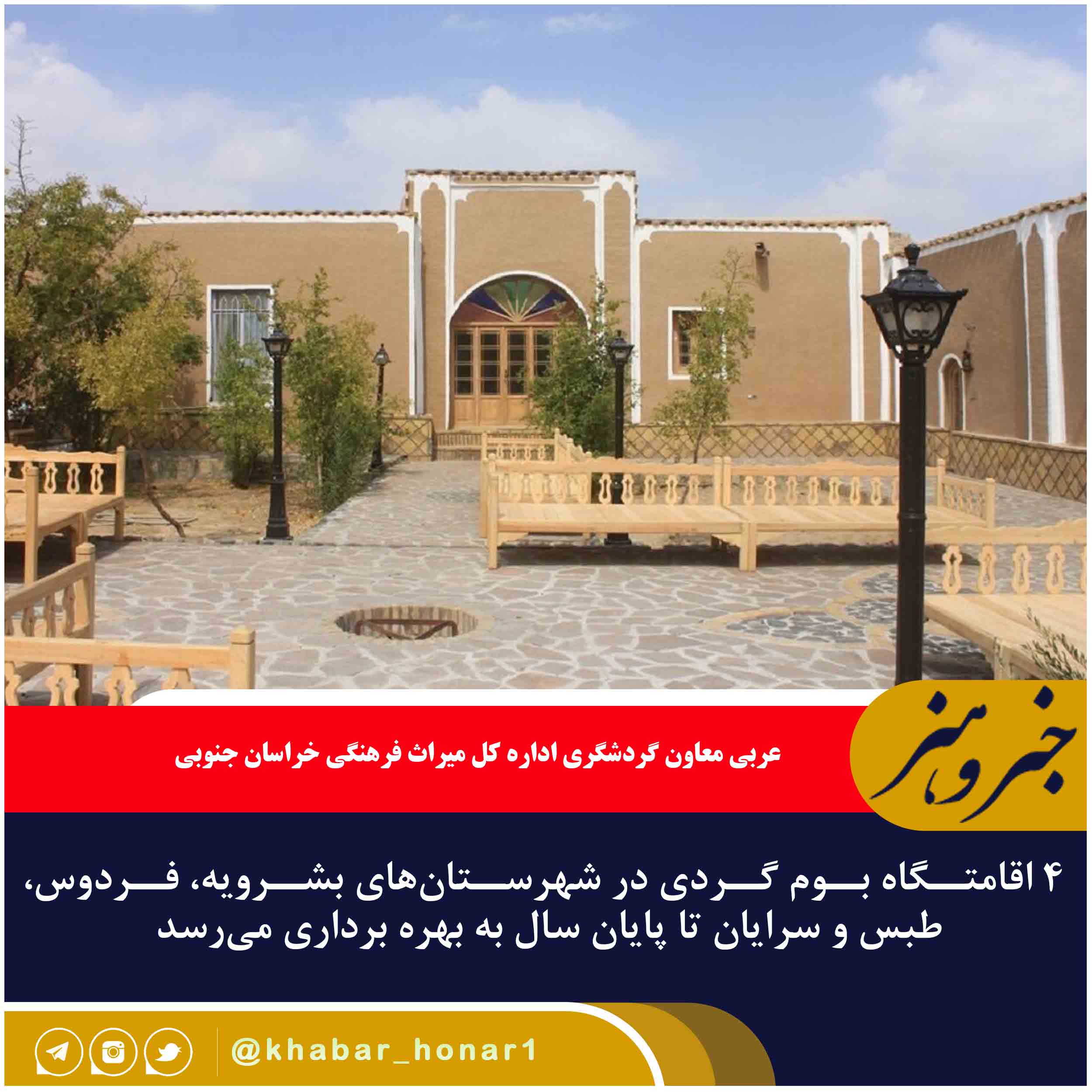 ۴ اقامتگاه بوم گردی در شهرستانهای بشرویه، فردوس، طبس و سرایان تا پایان سال به بهره برداری میرسد.