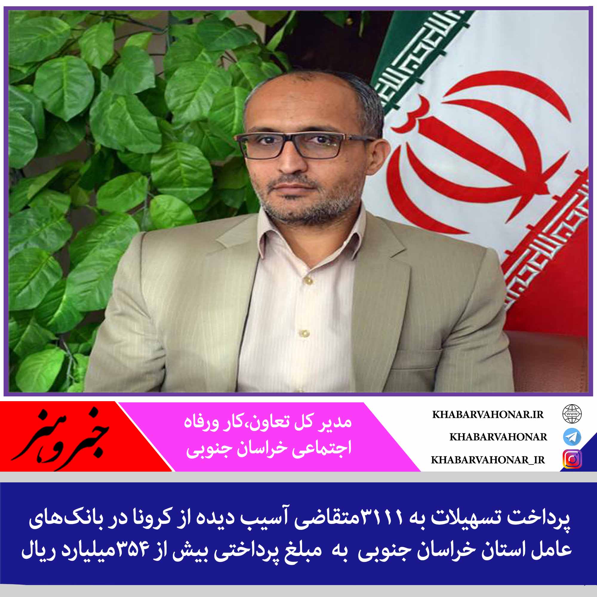 غلامرضا اشرفی. مدیر کل تعاون،کار ورفاه اجتماعی خراسان جنوبی خبر گفت تا کنون پرداخت تسهیلات به ۳۱۱۱متقاضی آسیب دیده از کرونا در بانکهای عامل استان خراسان جنوبی به مبلغ پرداختی بیش از ۳۵۴میلیارد ریال صورت گرفته است