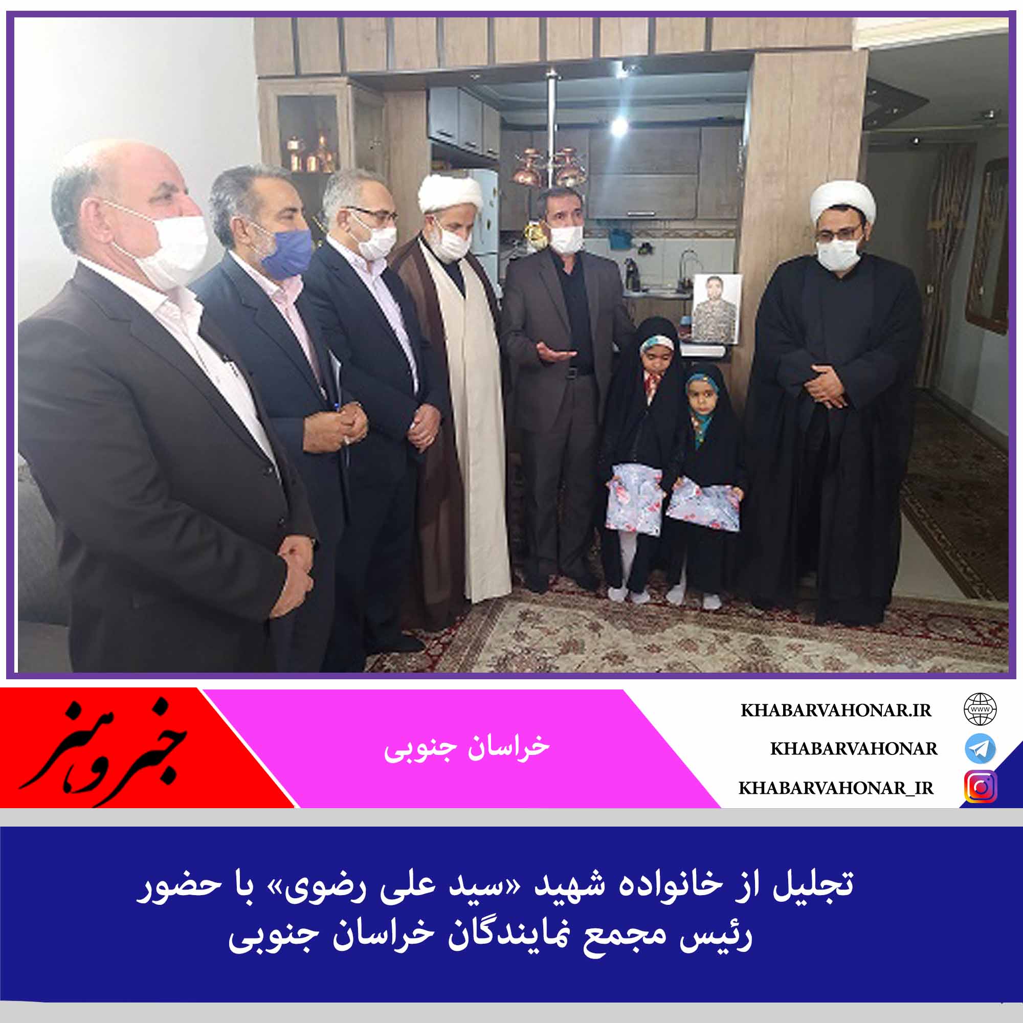 در پنجمین هفته از اجرای طرح ملی سهشنبههای تکریم در استان خراسان جنوبی، از خانواده شهید والامقام «سید علی رضوی» با حضور رئیس مجمع نمایندگان این استان تجلیل به عمل آمد.در این مراسم که صبح امروز سه شنبه ۷(مردادماه) برگزار شد، حجت الاسلام «ابراهیم سبزه کار» مدیر ستاد هماهنگی کانونهای فرهنگی هنری مساجد خراسان جنوبی، حجت الاسلام «نوفرستی» قائم مقام نماینده ولی فقیه در استان، «حسین خسروی اسفزار» رئیس مجمع نمایندگان خراسان جنوبی و نماینده مردم شهرستانهای بیرجند،خوسف و درمیان در مجلس شورای اسلامی «سید علی زمزم» معاون هنری و سینمایی اداره کل ارشاد، سالاری رئیس بنیاد شهید و امور ایثارگران شهرستان ،معاون فرهنگی و معاون توسعه اداره کل بنیاد شهید استان و اعضای کانون فرهنگی هنری «شهید فهمیده» حضور داشتند.