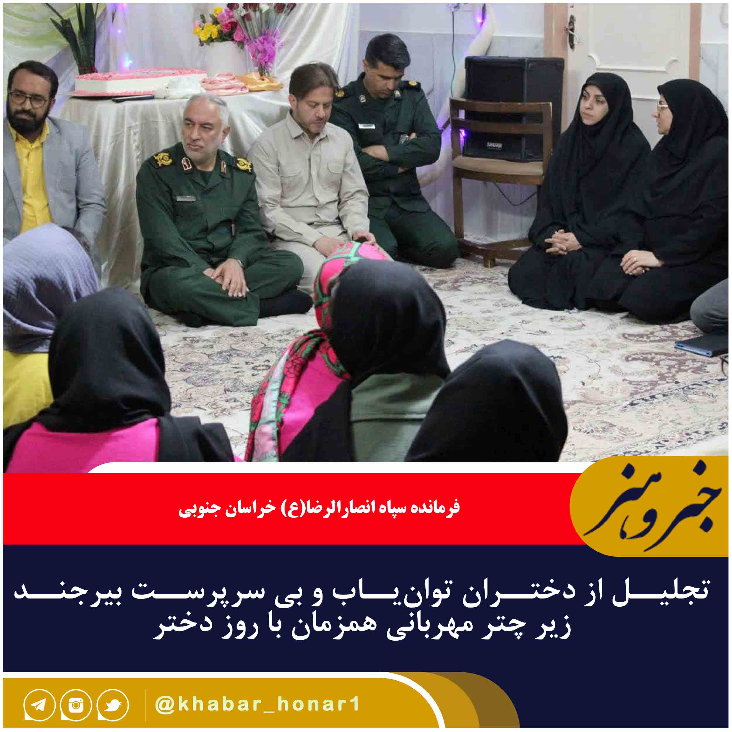 فرمانده سپاه انصارالرضا(ع) خراسان جنوبی بهمراه مسئول بسیج جامعه زنان سپاه استان به مناسبت آغاز دهه کرامت و سالروز میلاد حضرت معصومه(س) تحت عنوان برنامه “چتر مهربانی” از دو مرکز نگهداری دختران توانیاب و بیسرپرست بیرجند بازدید کردند.