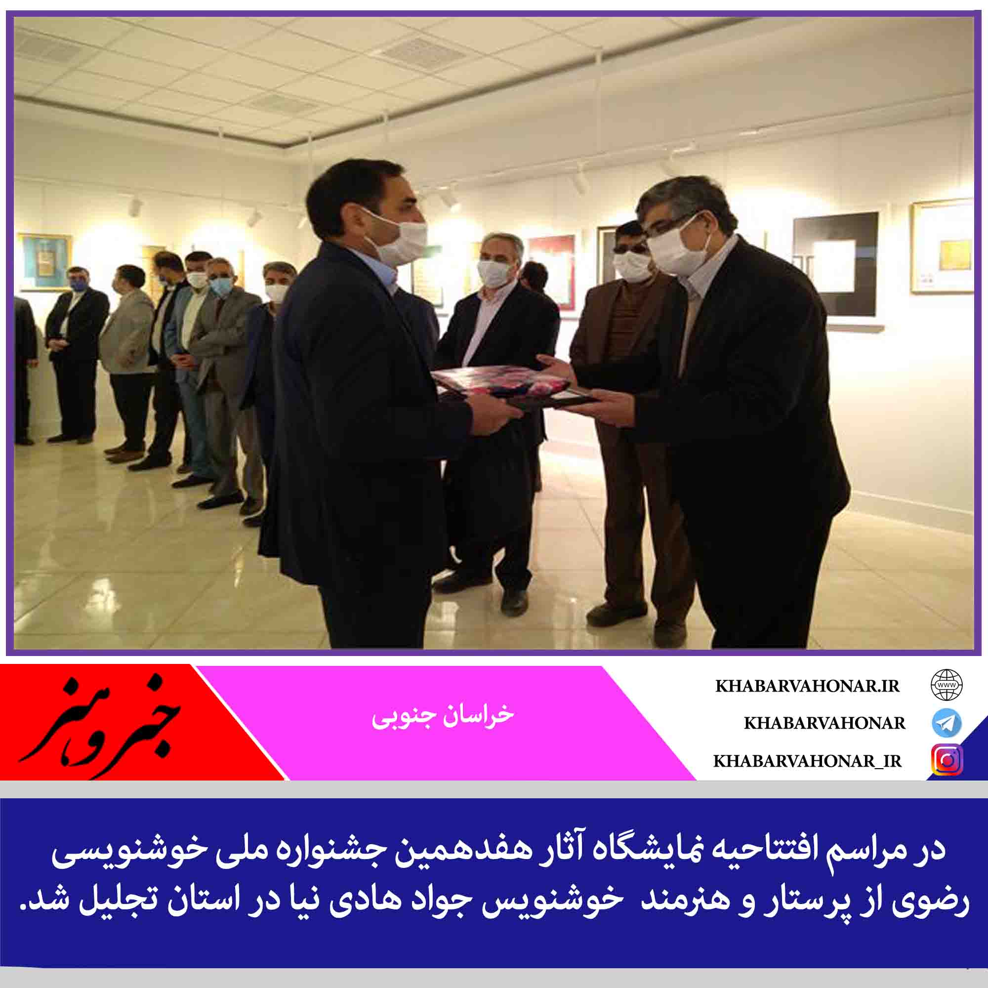 در مراسم افتتاحیه نمایشگاه آثار هفدهمین جشنواره ملی خوشنویسی رضوی از پرستار و هنرمند خوشنویس جواد هادی نیا در استان تجلیل شد.، در این مراسم که صبح شنبه ۲۹ آذرماه ۹۹ برگزار شد، از جواد هادی نیا دارای کارشناسی ارشد پرستاری و یکی از هنرمندان خوشنویس استان به مناسبت روز پرستار تقدیر شد.