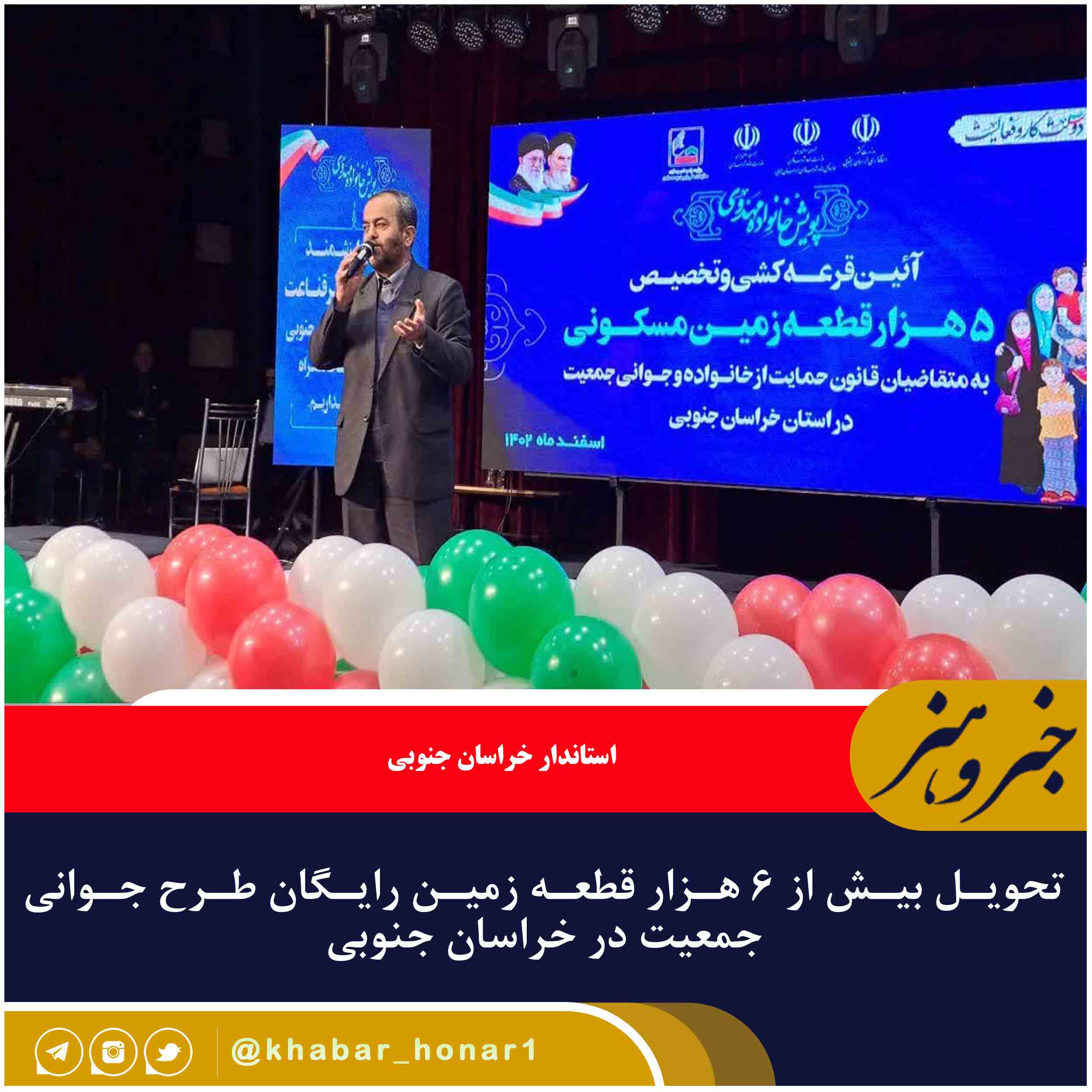 ?استاندار خراسان جنوبی از تحویل بیش از ۶ هزار قطعه زمین رایگان در قالب طرح جوانی جمعیت در سطح استان خبر داد.