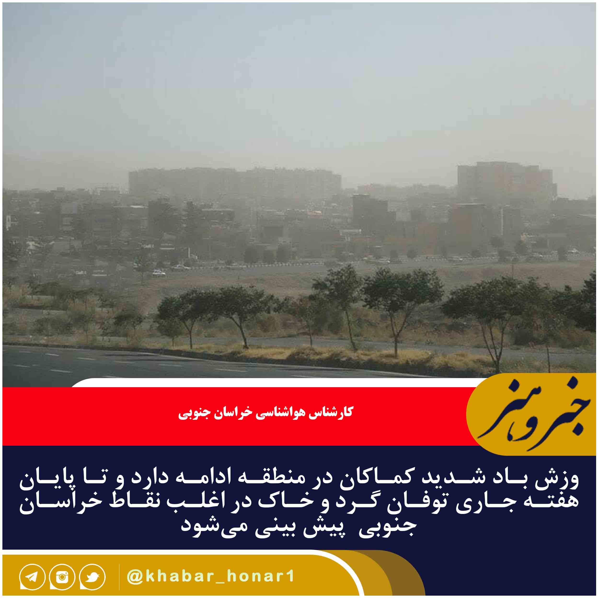 کارشناس هواشناسی خراسان جنوبی گفت: وزش باد شدید کماکان در منطقه ادامه دارد و تا پایان هفته جاری توفان گرد و خاک در اغلب نقاط خراسان جنوبی پیش بینی میشود.