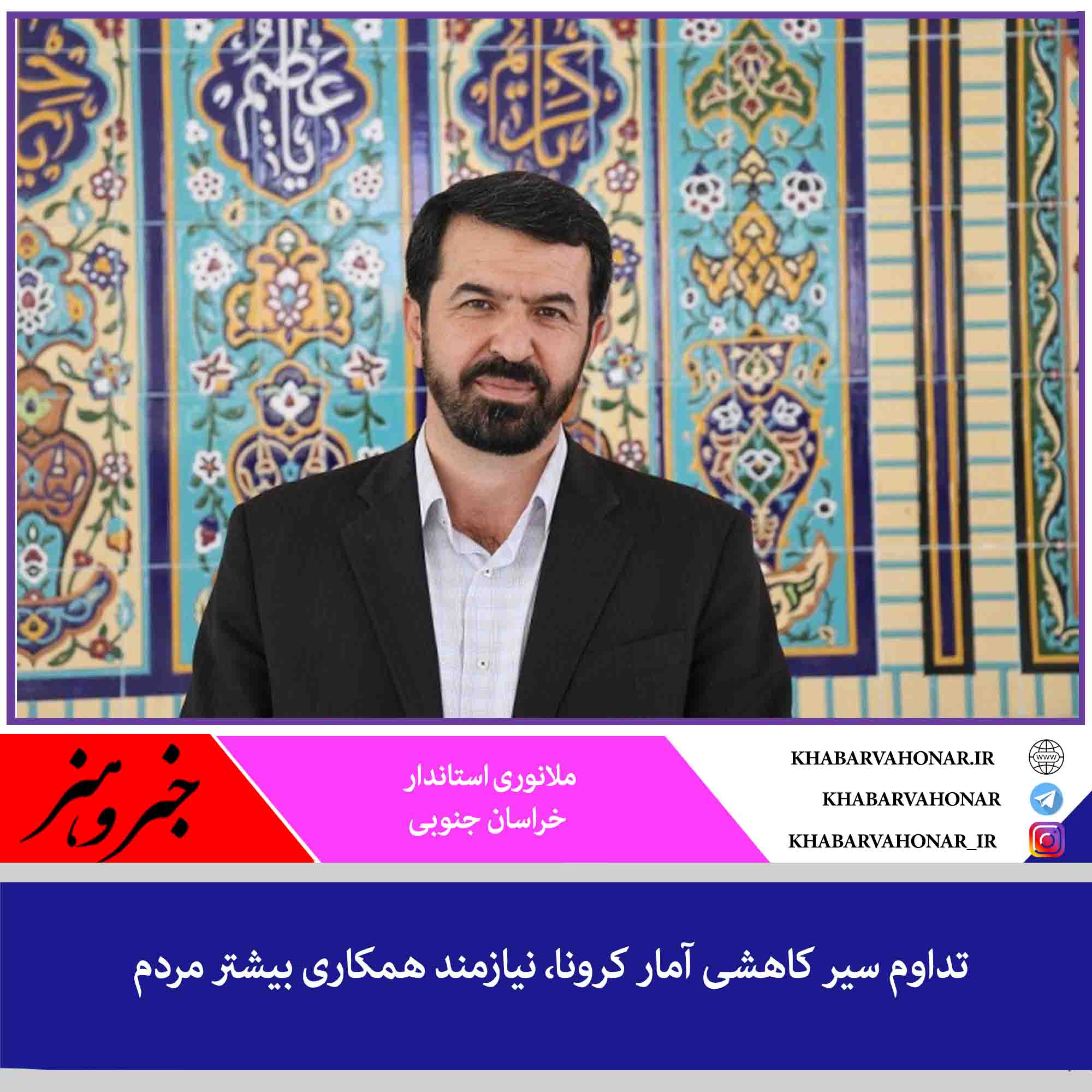 ملانوری استاندار خراسان جنوبی با اشاره به کاهش آمار مبتلایان کرونا در استان گفت: با همت، همراهی و تعامل مردم و دستگاههای اجرایی با مصوبات ستاد ملی و استانی کرونا، آمار ابتلا به بیماری و تعداد فوتیهای ناشی از کرونا در استان سیر نزولی پیدا کرده و بهتر است این همراهیها ادامه پیدا کند.