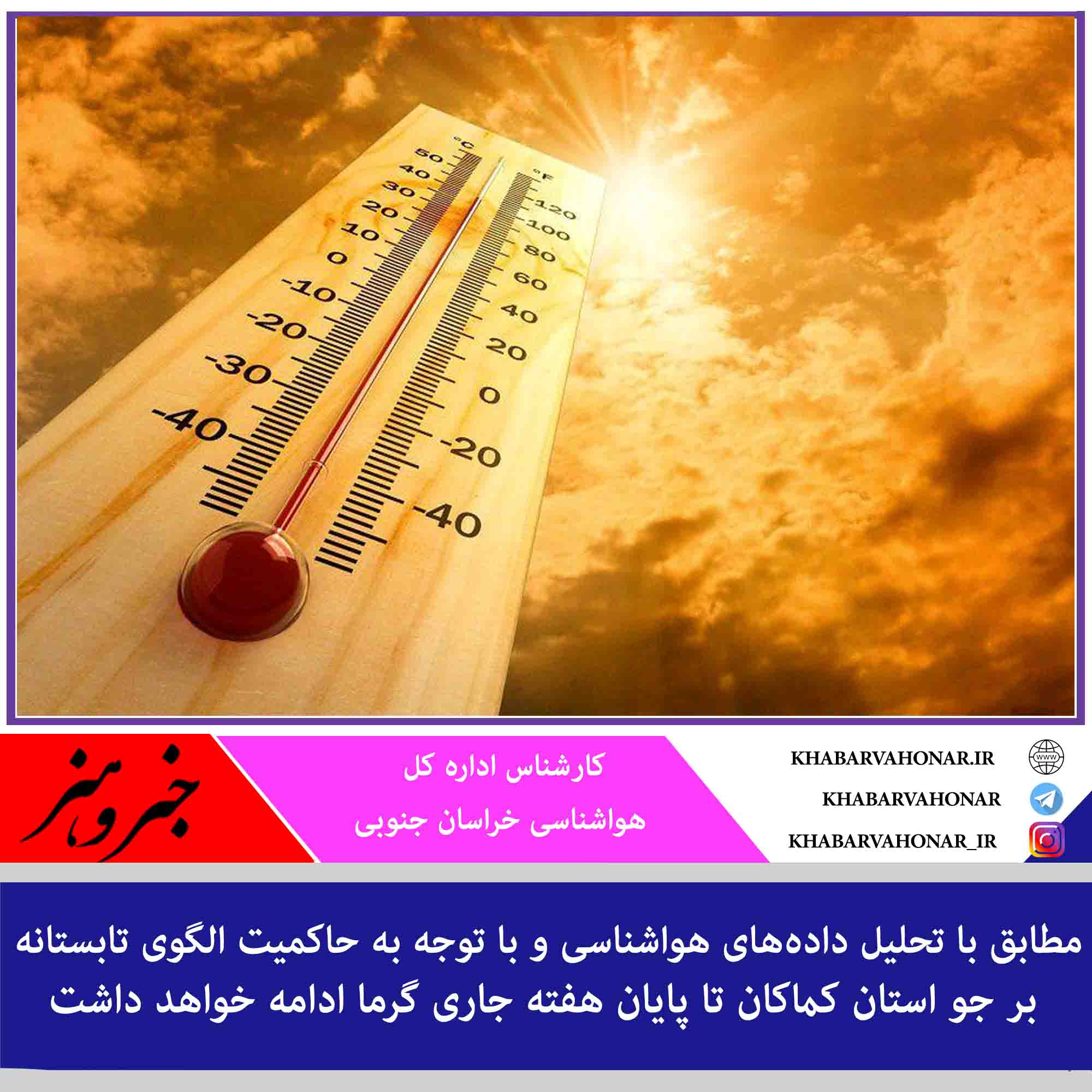 کارشناس اداره کل هواشناسی خراسان جنوبی گفت: مطابق با تحلیل دادههای هواشناسی و با توجه به حاکمیت الگوی تابستانه بر جو استان کماکان تا پایان هفته جاری گرما ادامه خواهد داشت.