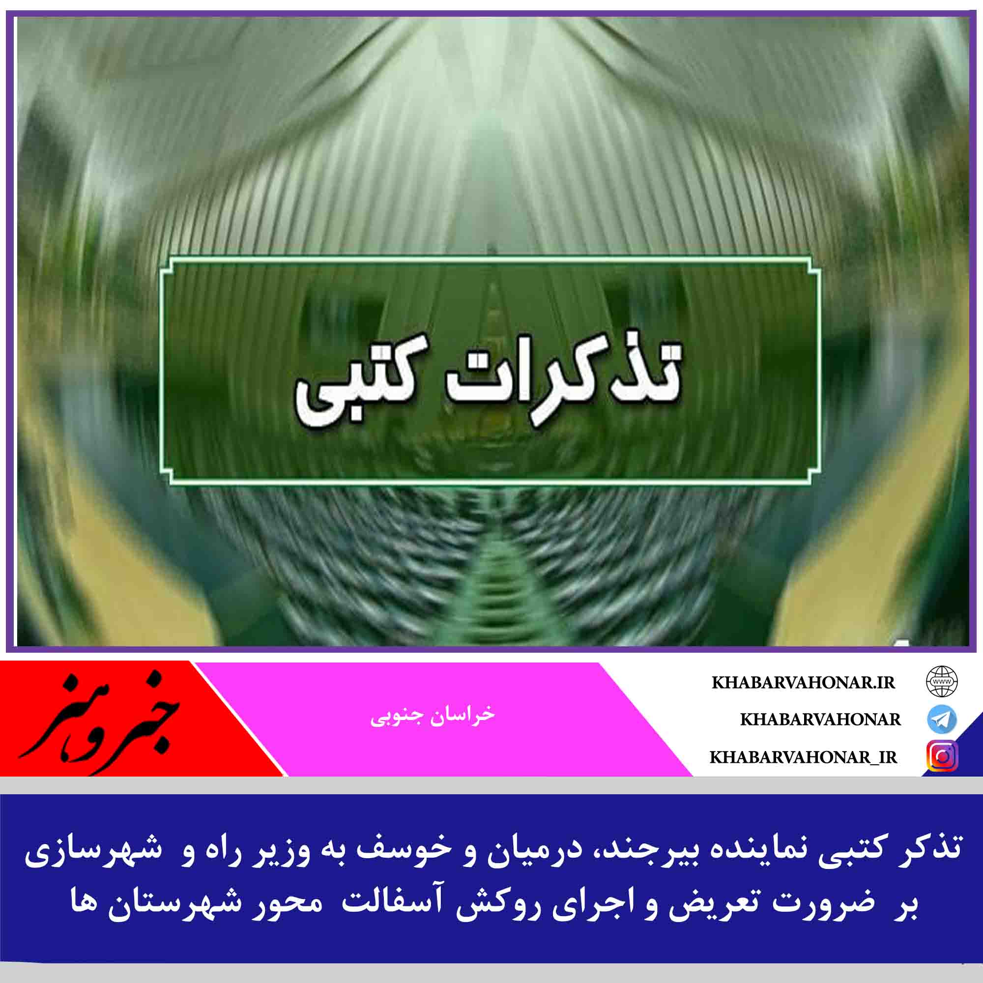 تذکر کتبی نماینده بیرجند، درمیان و خوسف به وزیر راه و شهرسازی بر ضرورت تعریض و اجرای روکش آسفالت محور شهرستان ها
