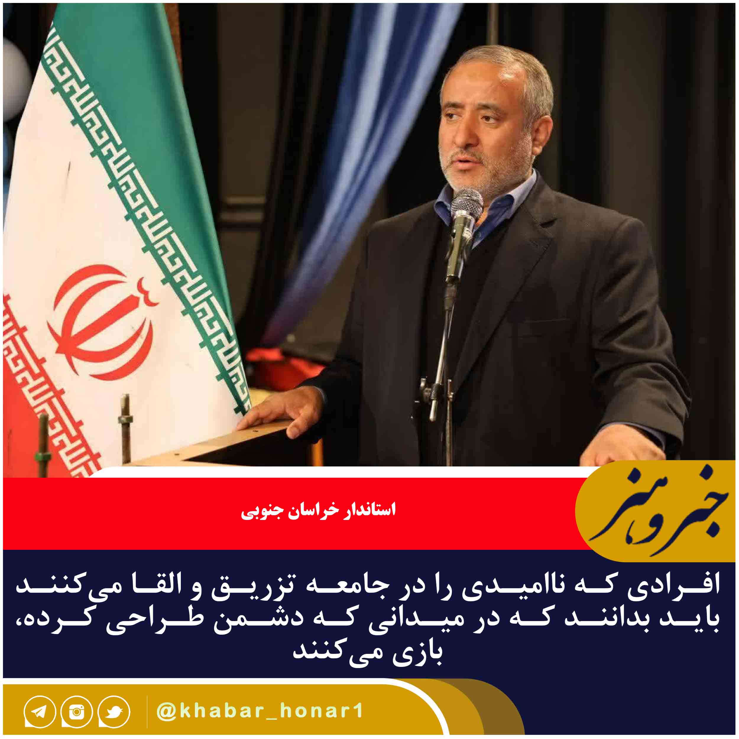 – استاندار خراسان جنوبی با تاکید بر ایجاد امید در میان مردم گفت: افرادی که ناامیدی را در جامعه تزریق و القا می‌کنند باید بدانند که در میدانی که دشمن طراحی کرده، بازی می‌کنند.