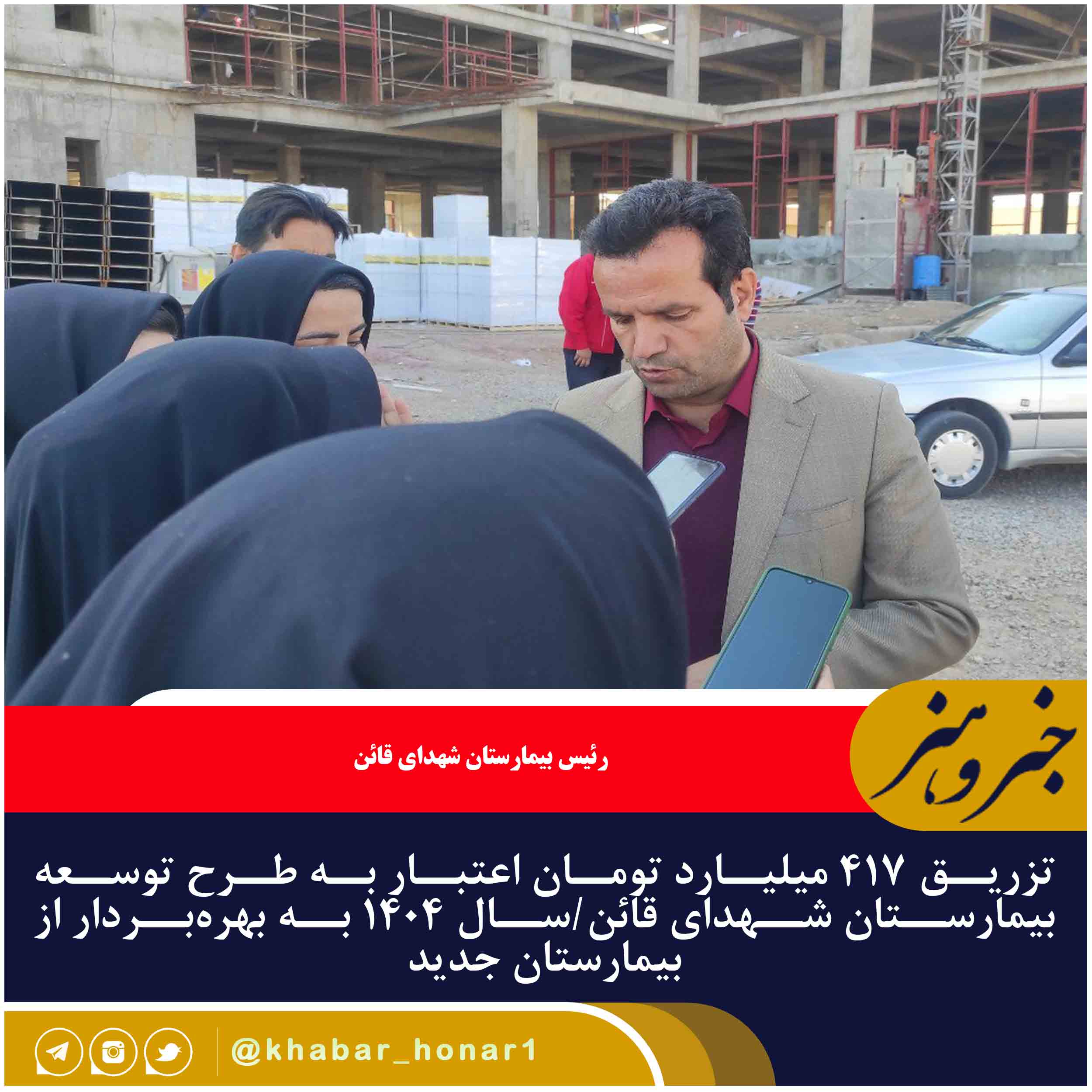 ? رئیس بیمارستان شهدای قائن، در جریان حضور تور رسانهای راویان پیشرفت در این شهرستان و بازدید از طرح توسعه بیمارستان شهدای قائن، بیان کرد: «با حمایت دولت سیزدهم، این پروژه ۴۱۷ میلیارد تومان تخصیص اعتبار داشته و بر اساس برنامهریزیهای انجام شده تا سال ۱۴۰۴ به بهرهبرداری میرسد».