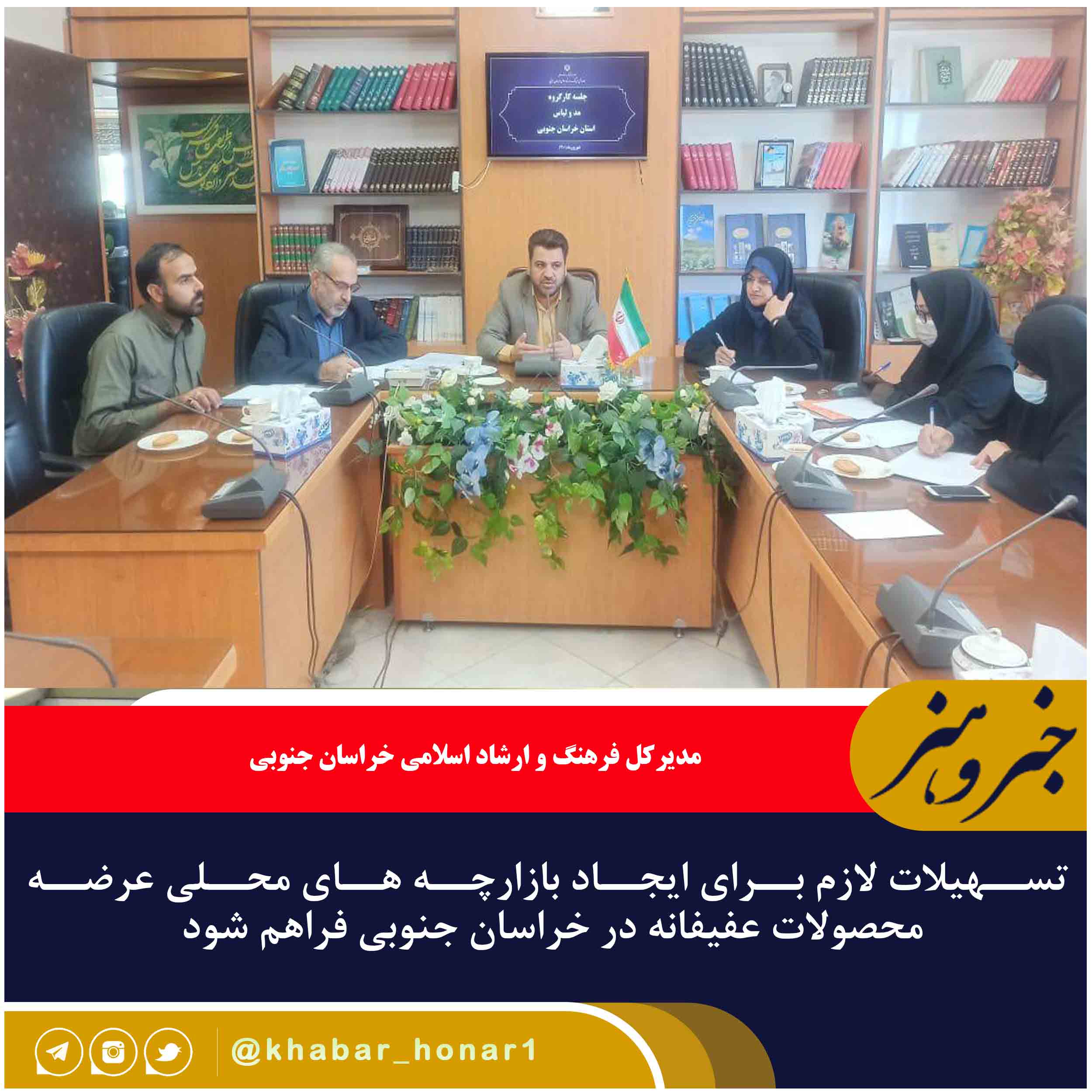 مدیرکل فرهنگ و ارشاد اسلامی خراسان جنوبی خواستار فراهم کردن تسهیلات لازم برای راه اندازی بازارچه های محلی عرضه محصولات و البسه عفیفانه در شهرستان های قاین، طبس، فردوس و نهبندان شد
