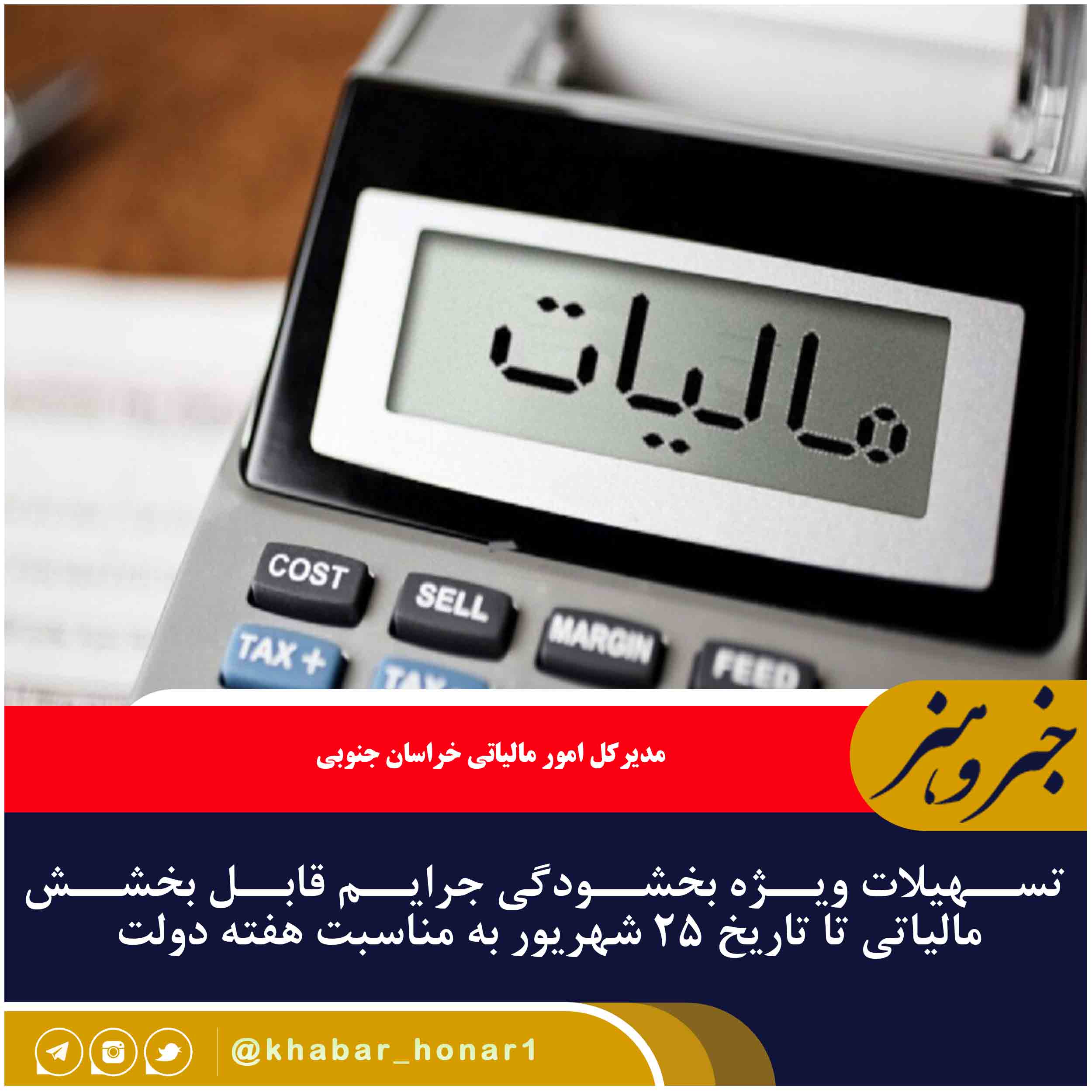 مدیرکل امور مالیاتی خراسان جنوبی از تسهیلات ویژه بخشودگی جرایم قابل بخشش مالیاتی به مناسبت گرامیداشت هفته دولت خبر دارد.