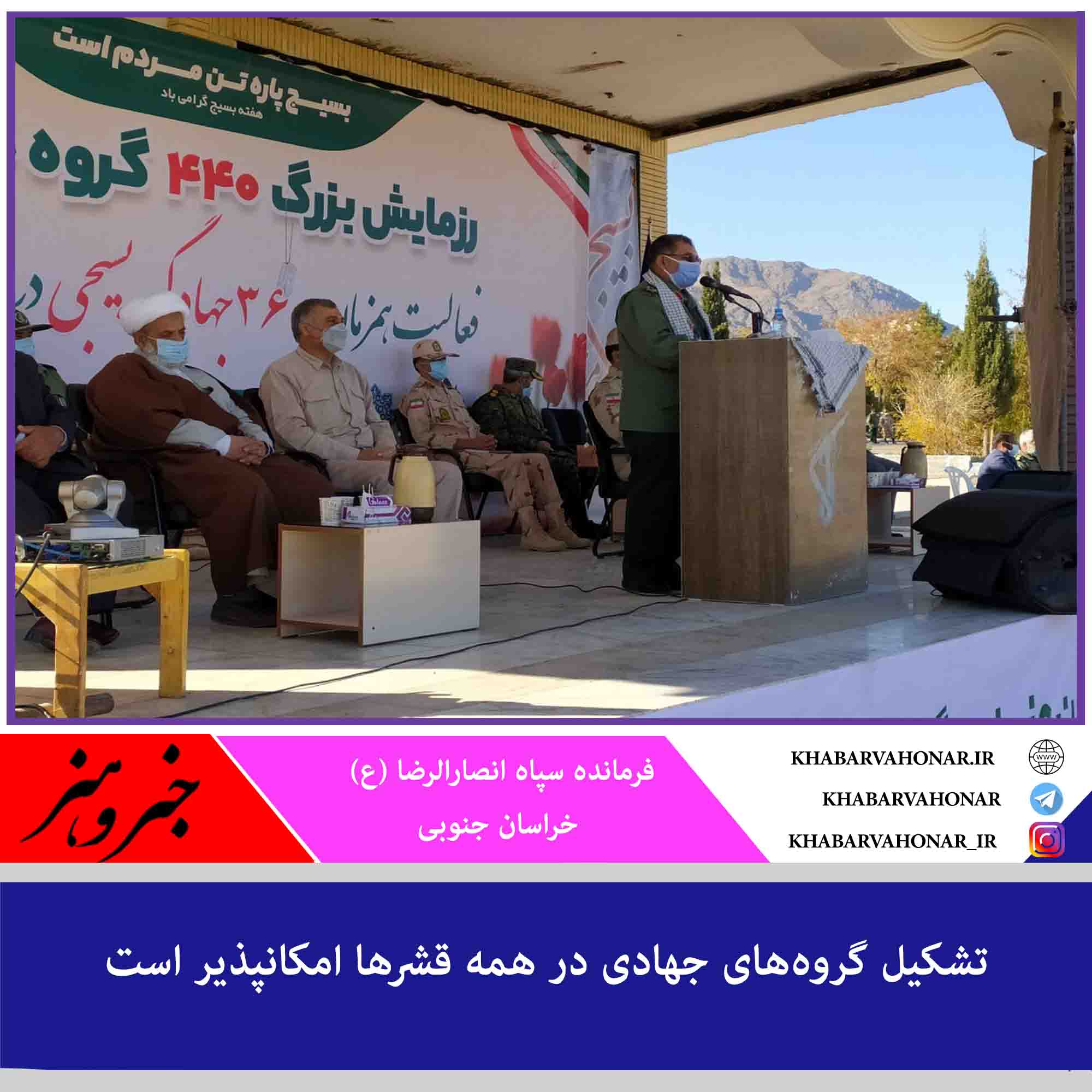 فرمانده سپاه انصارالرضا (ع) خراسان جنوبی گفت: تشکیل گروههای جهادی در همه قشرها امکانپذیر است و تاکنون هزار و ۶۰۰ گروه جهادی در قالب اقشار مختلف در این استان ساماندهی شدهاند.