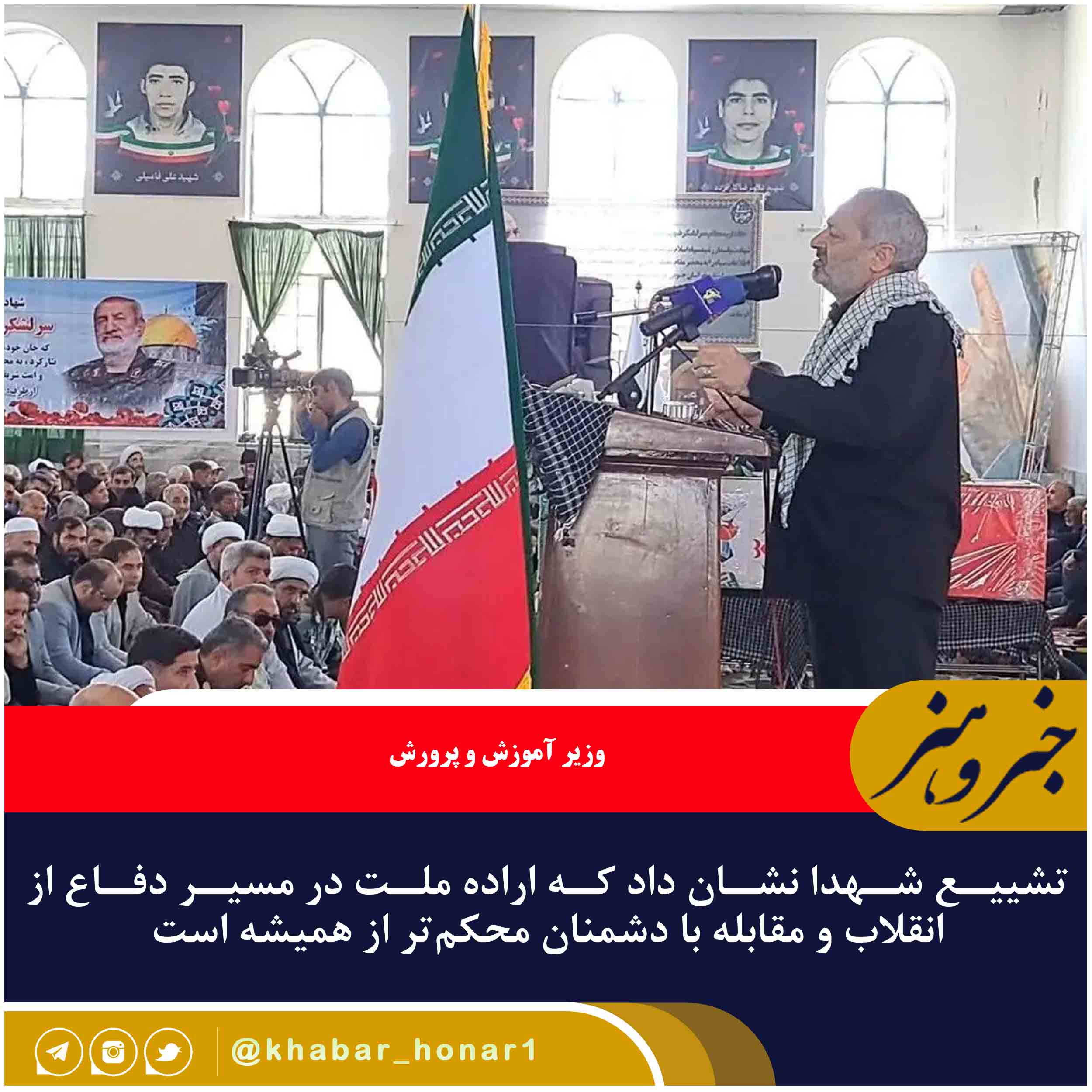 وزیر آموزش و پرورش با بیان اینکه ملت ایران از شهادت هراسی ندارد، گفت: حضور پرشور مردم در تشییع شهدا نشان داد که اراده ملت در مسیر دفاع از انقلاب و مقابله با دشمنان محکمتر از همیشه است.