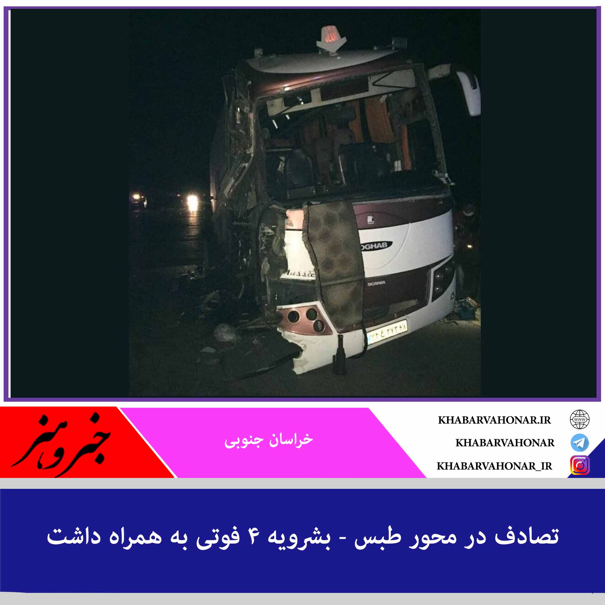 رییس پلیس راه خراسان جنوبی گفت: بر اثر برخورد کامیون کشنده با اتوبوس در محور طبس – بشرویه چهار نفر کشته و ۶ نفر مصدوم شدند.