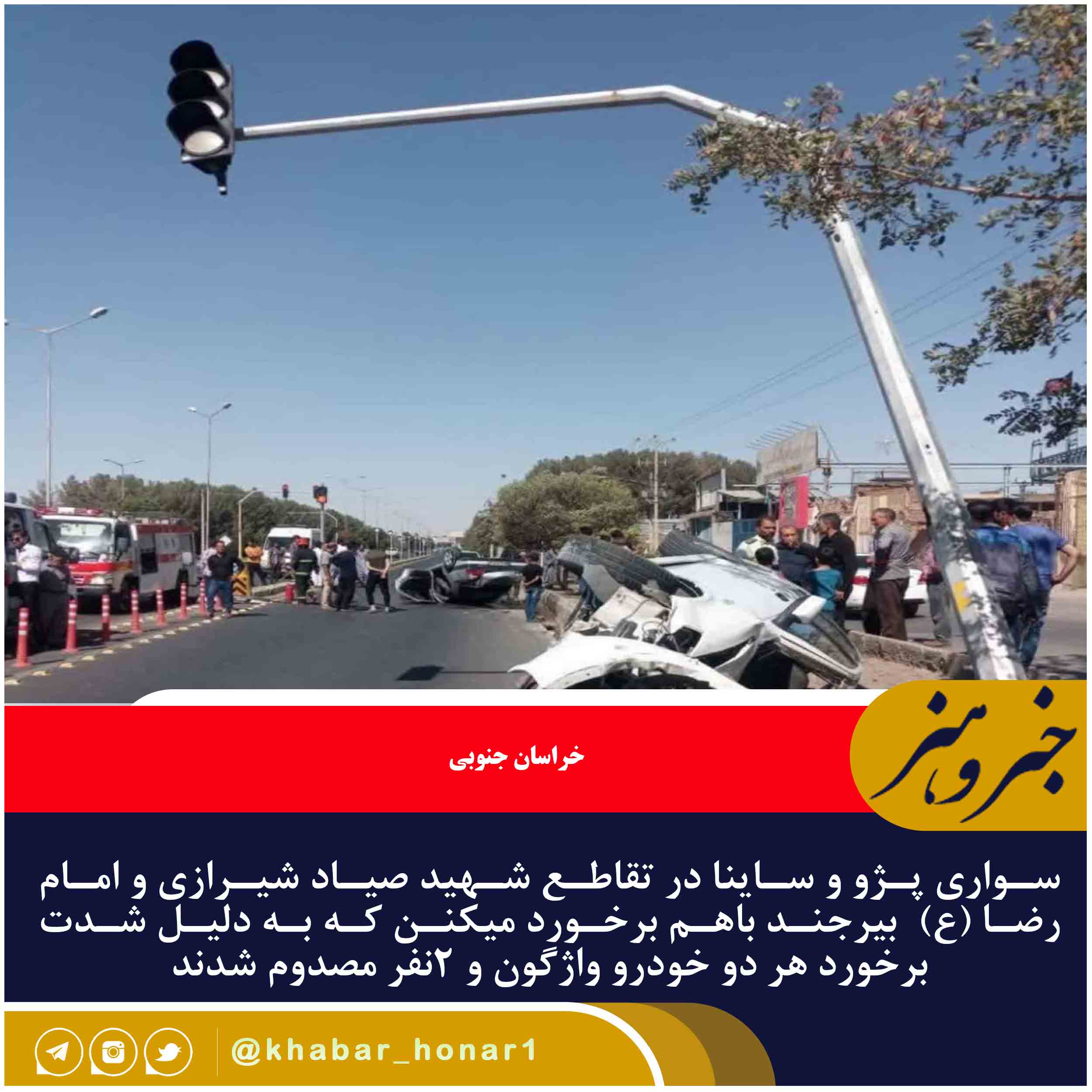 ?سواری پژو و ساینا در تقاطع شهید صیاد شیرازی و امام رضا (ع) بیرجند باهم برخورد میکنن که به دلیل شدت برخورد هر دو خودرو واژگون و ۲نفر مصدوم شدند.