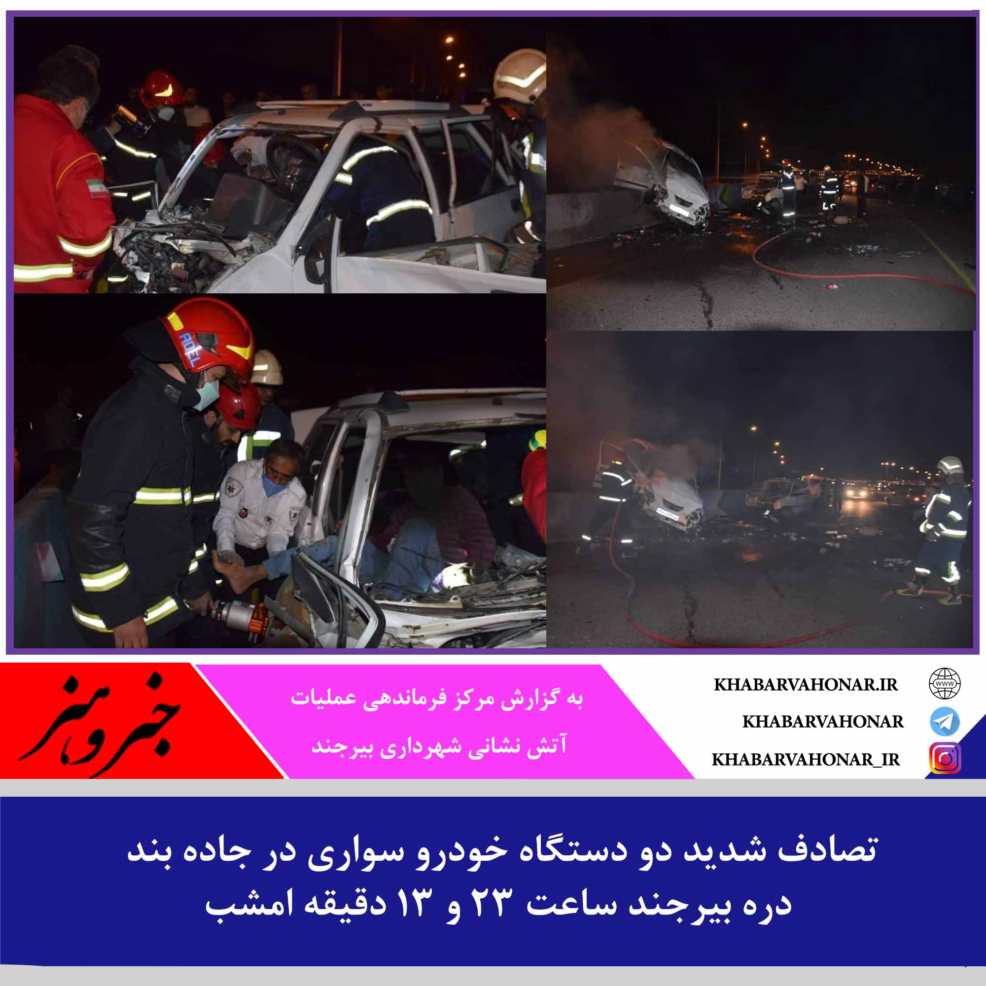 تصادف شدید دو دستگاه خودرو سواری در جاده بند دره که ساعت ۲۳ و ۱۳ دقیقه امشب به مرکز فرماندهی عملیات آتش نشانی اعلام شد و همزمان دو تیم عملیاتی از ایستگاههای سجاد و غفاری جهت رهاسازی ۳ مصدوم و اطفا حریق خودرو تیبا به محل اعزام شدند