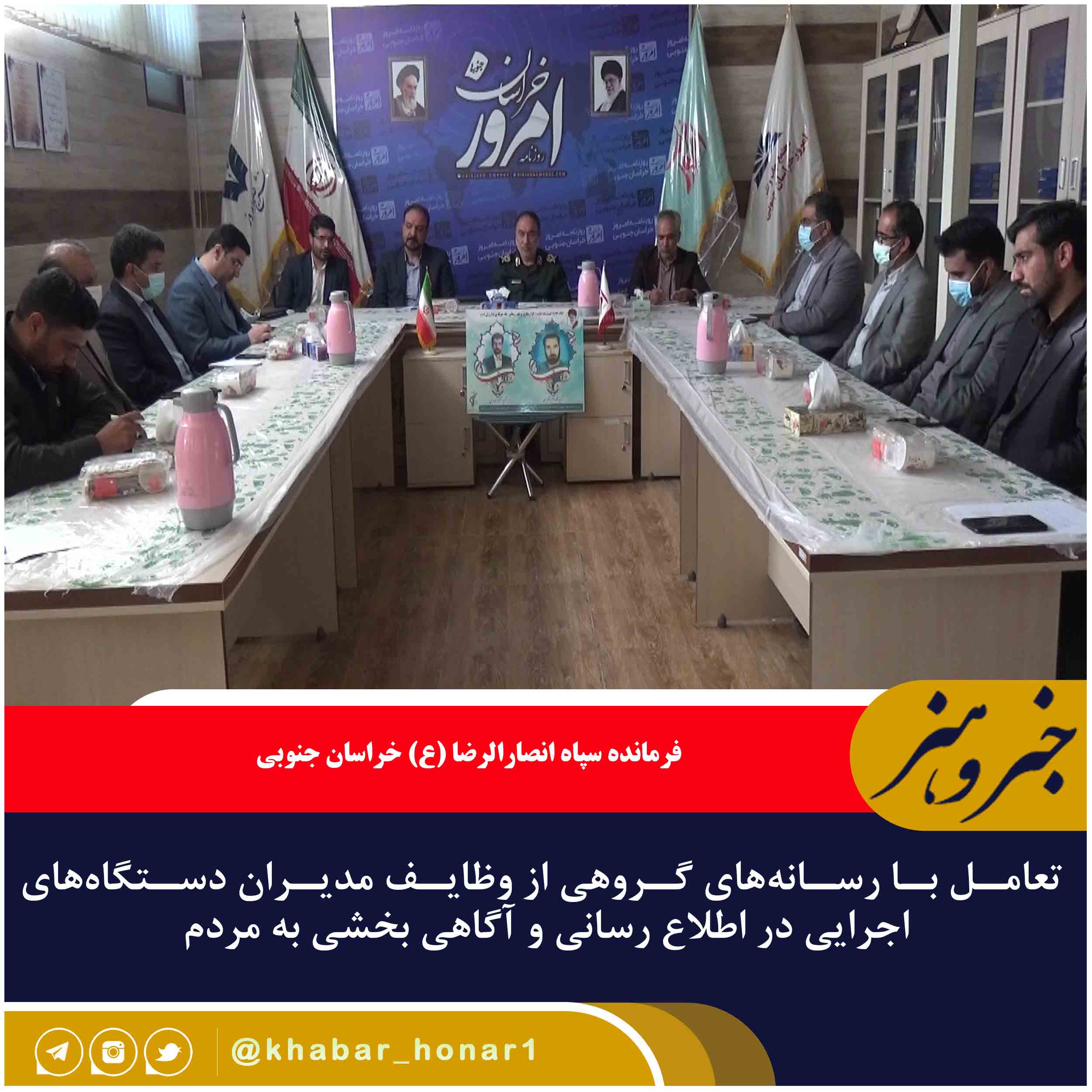 فرمانده سپاه انصارالرضا (ع) خراسان جنوبی، تعامل با رسانههای گروهی را از وظایف مدیران دستگاههای اجرایی در اطلاع رسانی و آگاهی بخشی به مردم دانست.