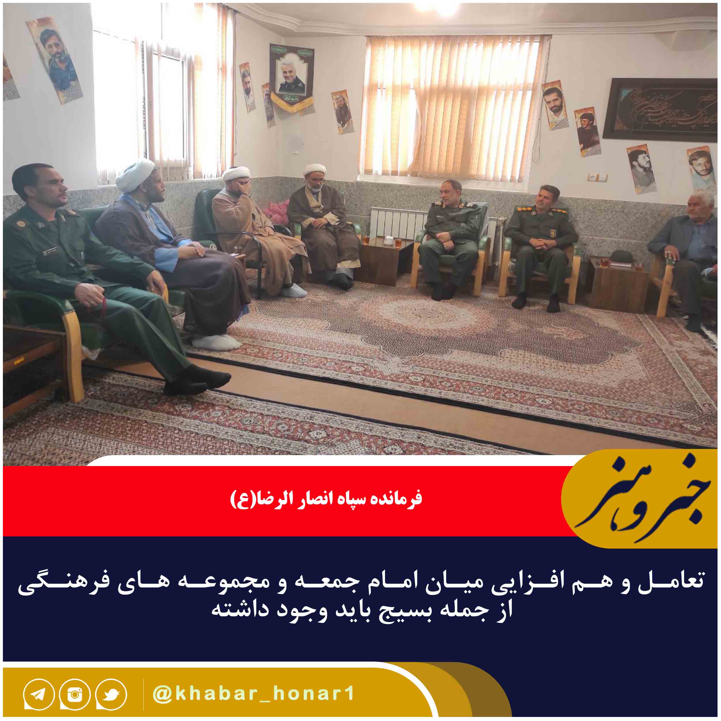 فرمانده سپاه انصار الرضا(ع) گفت:تعامل و هم افزایی میان امام جمعه و مجموعه های فرهنگی از جمله بسیج باید وجود داشته باشد تا در جهت پیشرفت نظام تصمیمات درستی گرفته شود که موثر باشد.