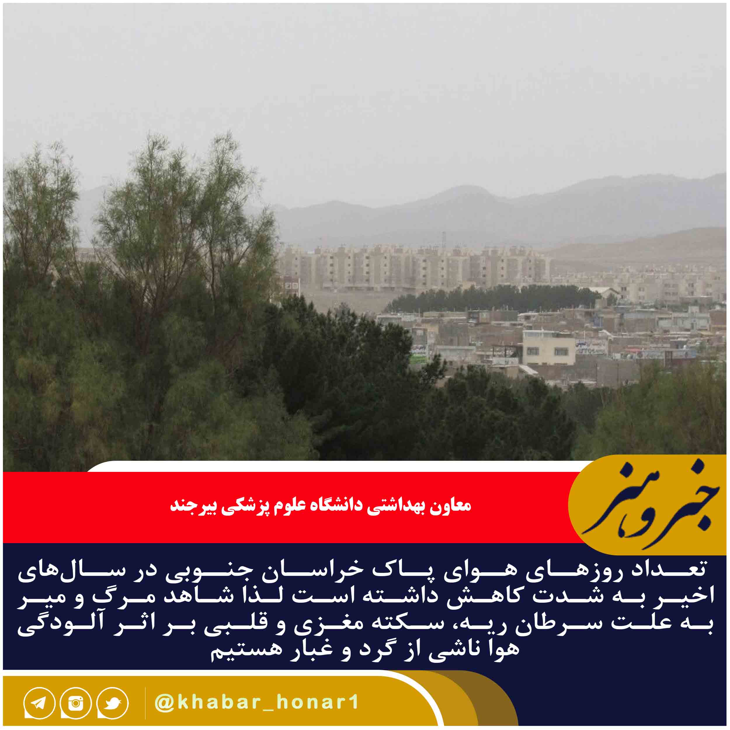 معاون بهداشتی دانشگاه علوم پزشکی بیرجند گفت: تعداد روزهای هوای پاک خراسان جنوبی در سالهای اخیر به شدت کاهش داشته است لذا شاهد مرگ و میر به علت سرطان ریه، سکته مغزی و قلبی بر اثر آلودگی هوا ناشی از گرد و غبار هستیم.