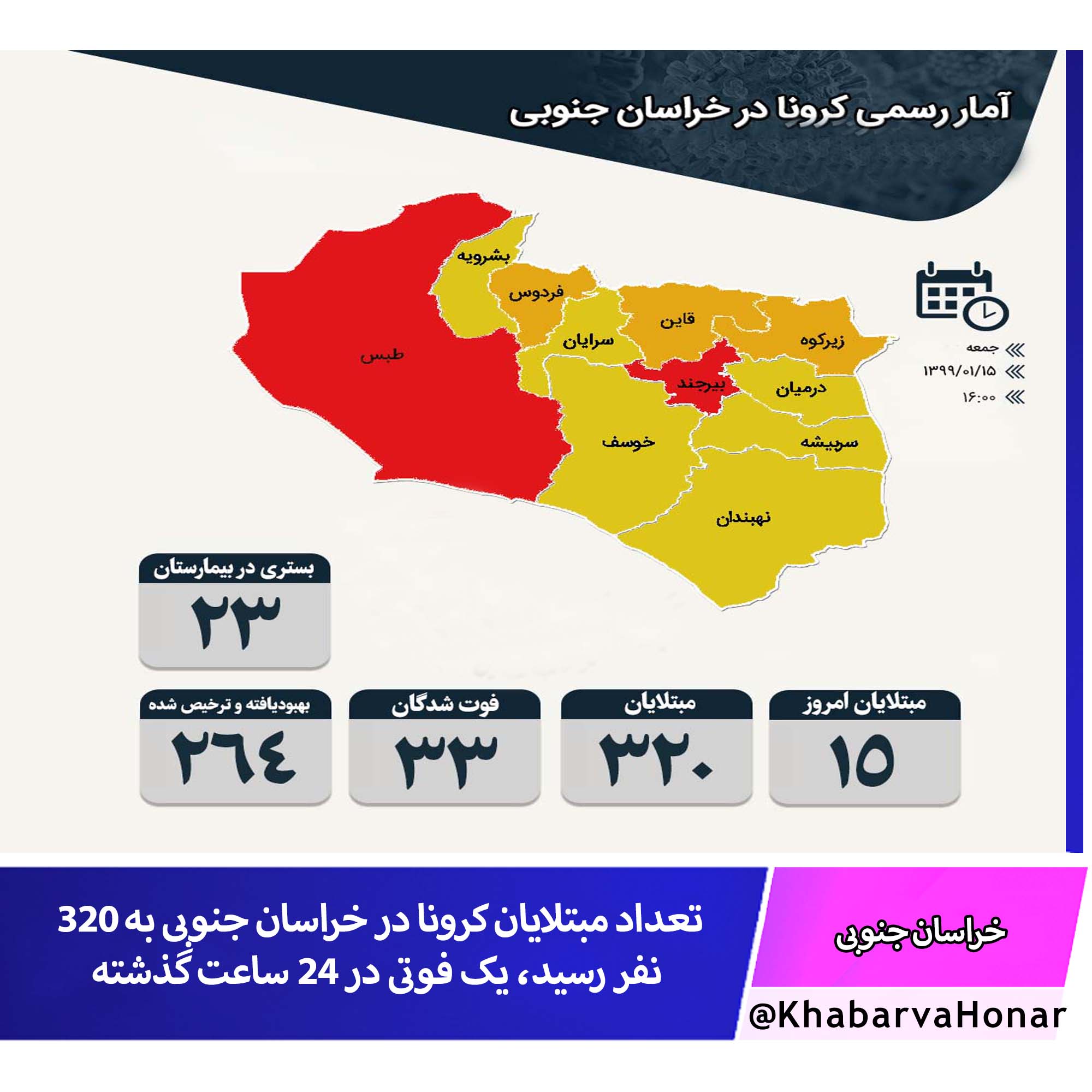 ✳️دکتر مهدی زاده معاون بهداشتی دانشگاه علوم پزشکی بیرجنددر گفتگو با رادیو خراسان جنوبی گفت: ۱۵مورد جدید مبتلا به ویروس کرونا در ۲۴ ساعت گذشته در استان شناسایی شد، که بدین ترتیب آمار کل مبتلایان استان به ۳۲۰نفر افزایش یافت.