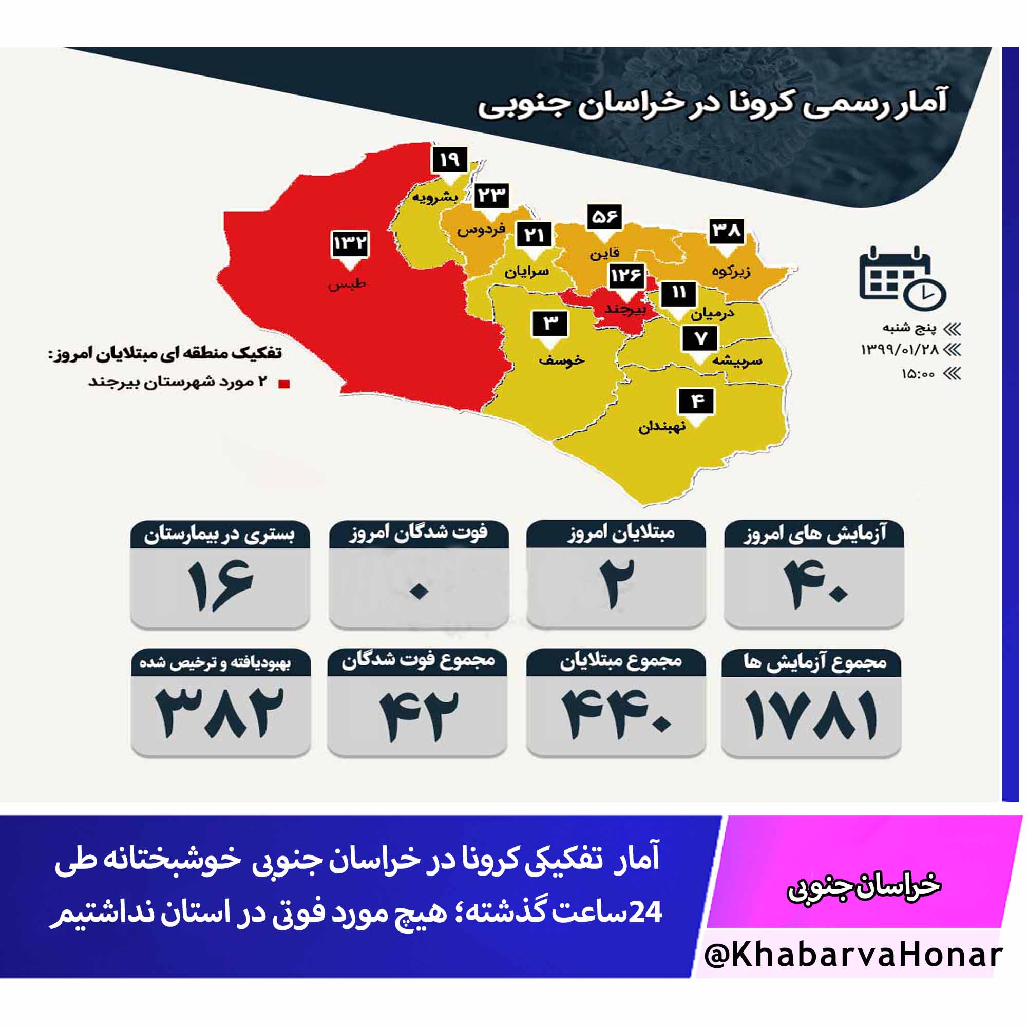 ✳️ دکتر مهدی زاده معاون بهداشتی دانشگاه علوم پزشکی بیرجند گفت: ۲ مورد جدید مبتلا به ویروس کرونا در ۲۴ ساعت گذشته در استان شناسایی شد، که بدین ترتیب آمار کل مبتلایان استان به ۴۴۰ نفر افزایش یافت.