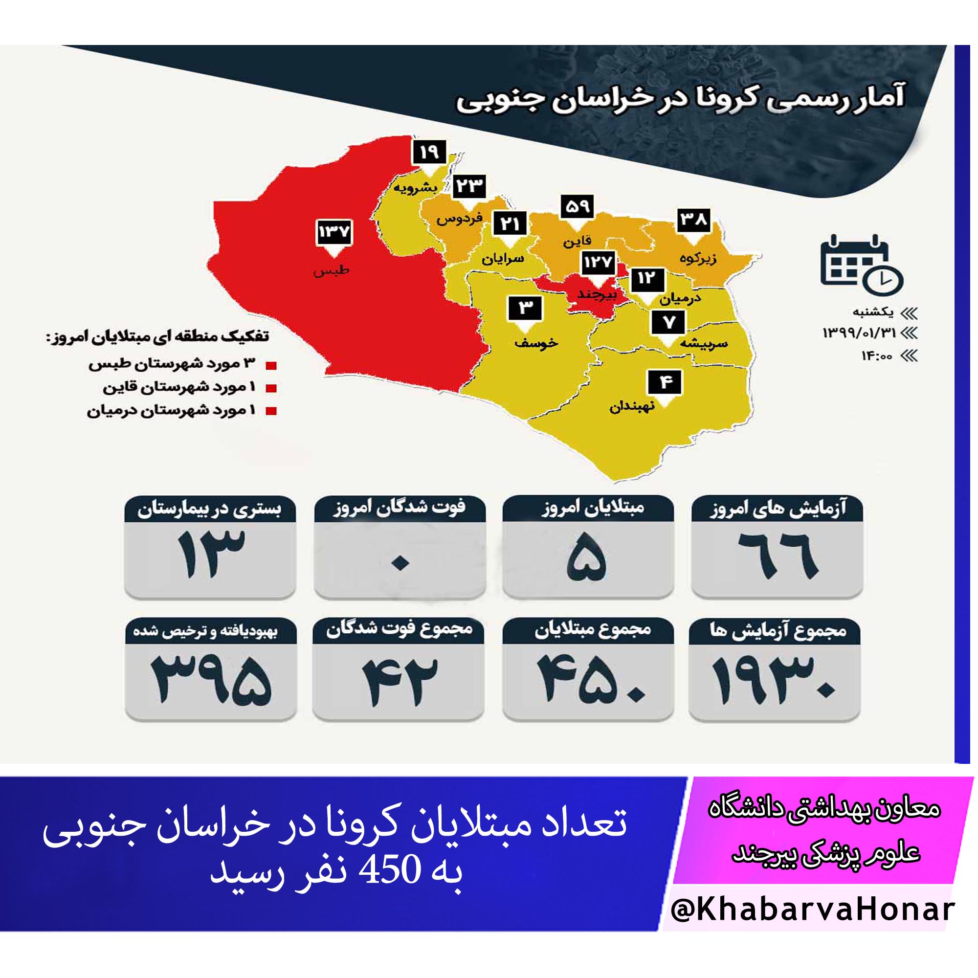 ✳️ دکتر مهدی زاده معاون بهداشتی دانشگاه علوم پزشکی بیرجند د گفت: ۵ مورد جدید مبتلا به ویروس کرونا در ۲۴ ساعت گذشته در استان شناسایی شد، که بدین ترتیب آمار کل مبتلایان استان به ۴۵۰ نفر افزایش یافت.