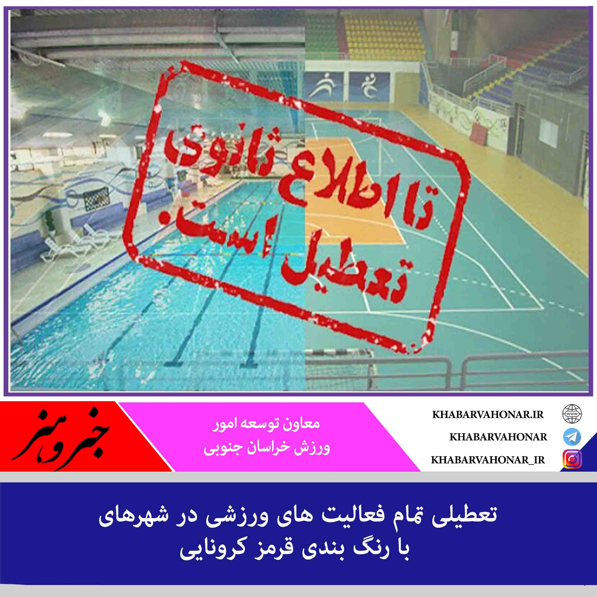 ?معاون توسعه امور ورزش خراسان جنوبی گفت: مطابق با مصوبات جلسه ستاد مدیریت کرونا در استان، تمام اماکن، باشگاه ها و فعالیت های ورزشی در شهرهای قرمز استان از امروز چهارشنبه ۱۸ فروردین ماه تا اطلاع بعدی تعطیل اعلام می شود.