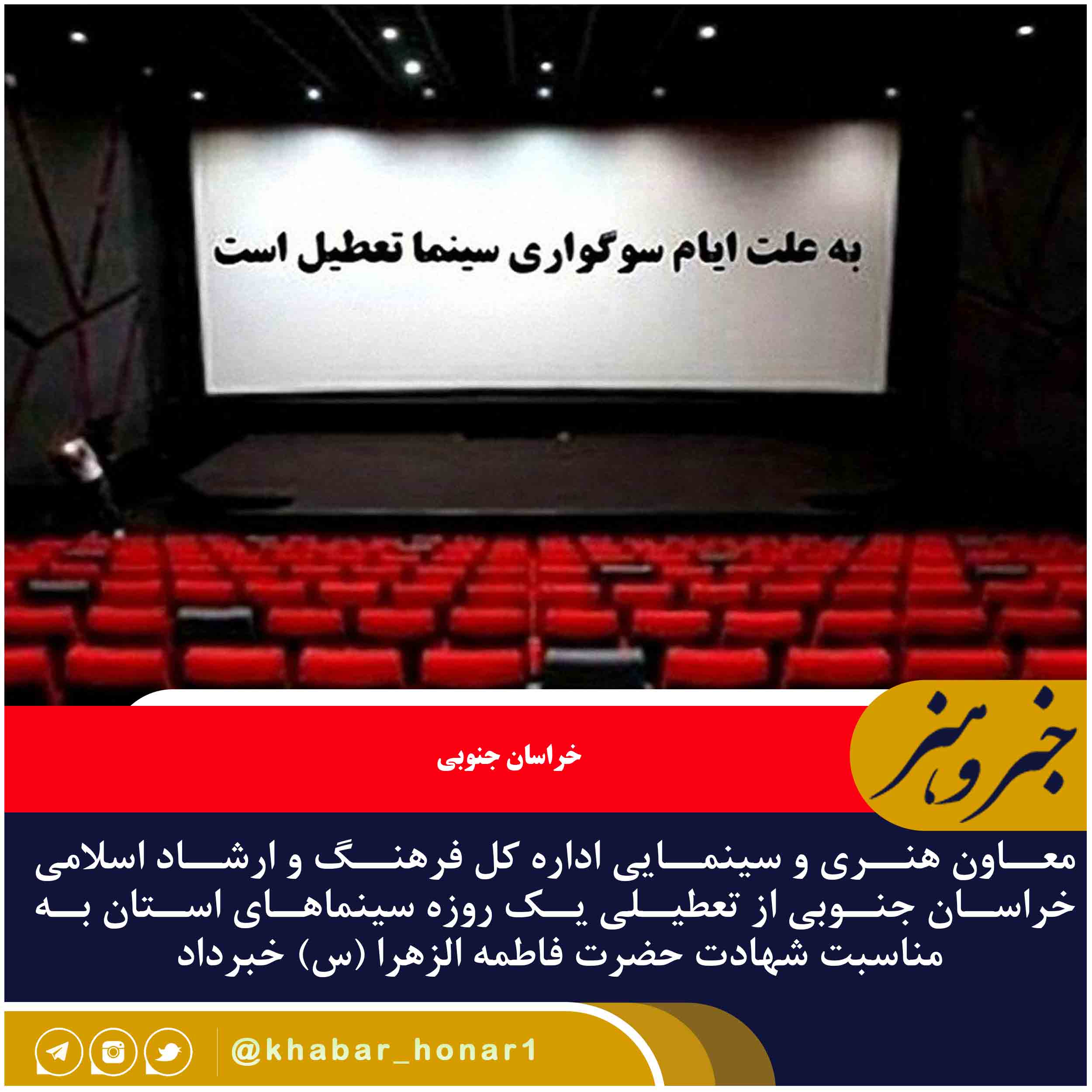 ?معاون هنری و سینمایی اداره کل فرهنگ و ارشاد اسلامی خراسان جنوبی از تعطیلی یک روزه سینماهای استان به مناسبت شهادت حضرت فاطمه الزهرا (س) خبرداد.
