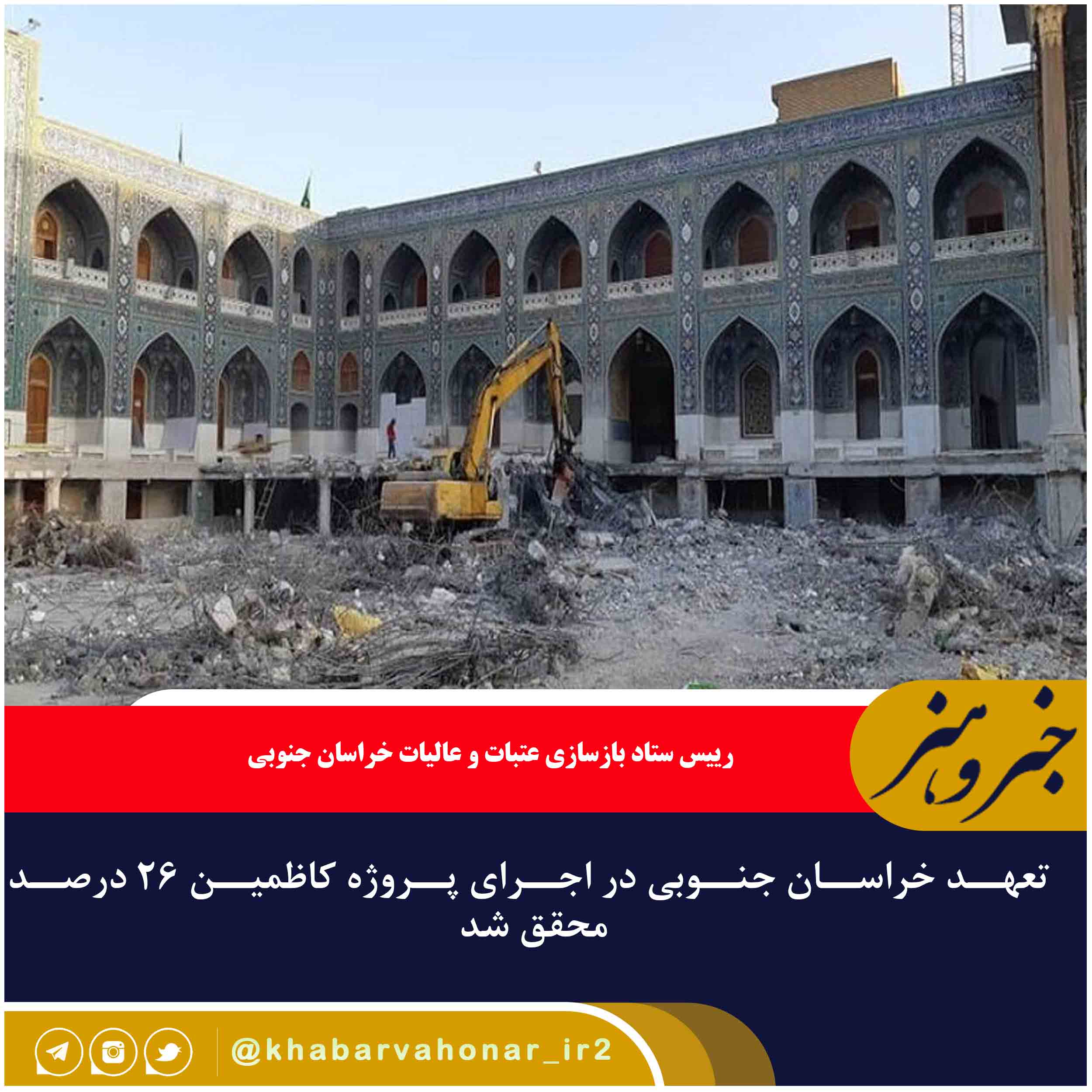 رییس ستاد بازسازی عتبات و عالیات خراسان جنوبی گفت: تعهد خراسان جنوبی در ساخت صحن امام باقر(ع) در شهر کاظمین عراق در سال جاری، ۲۶ درصد محقق شده است.