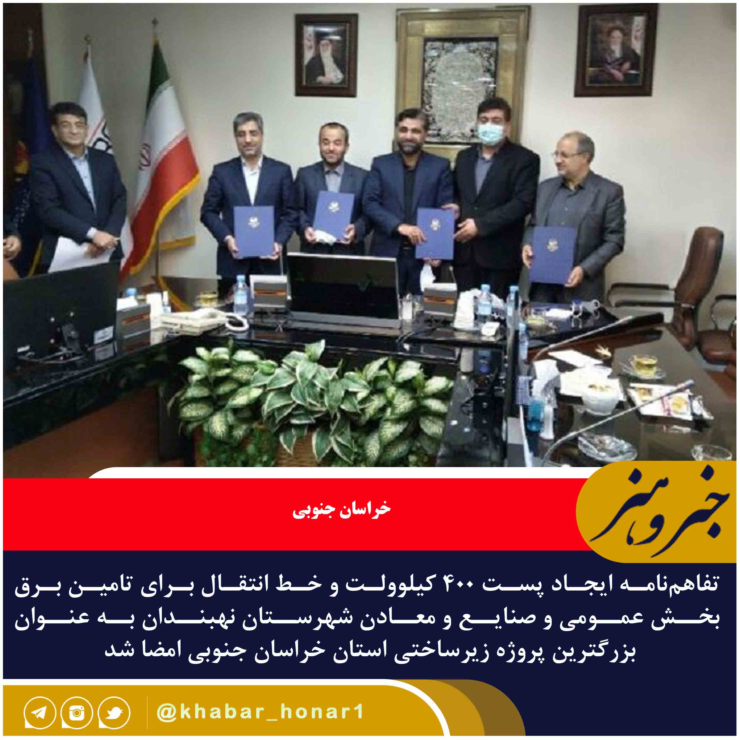 تفاهمنامه ایجاد پست ۴۰۰ کیلوولت و خط انتقال برای تامین برق بخش عمومی و صنایع و معادن شهرستان نهبندان به عنوان بزرگترین پروژه زیرساختی استان خراسان جنوبی امضا شد.