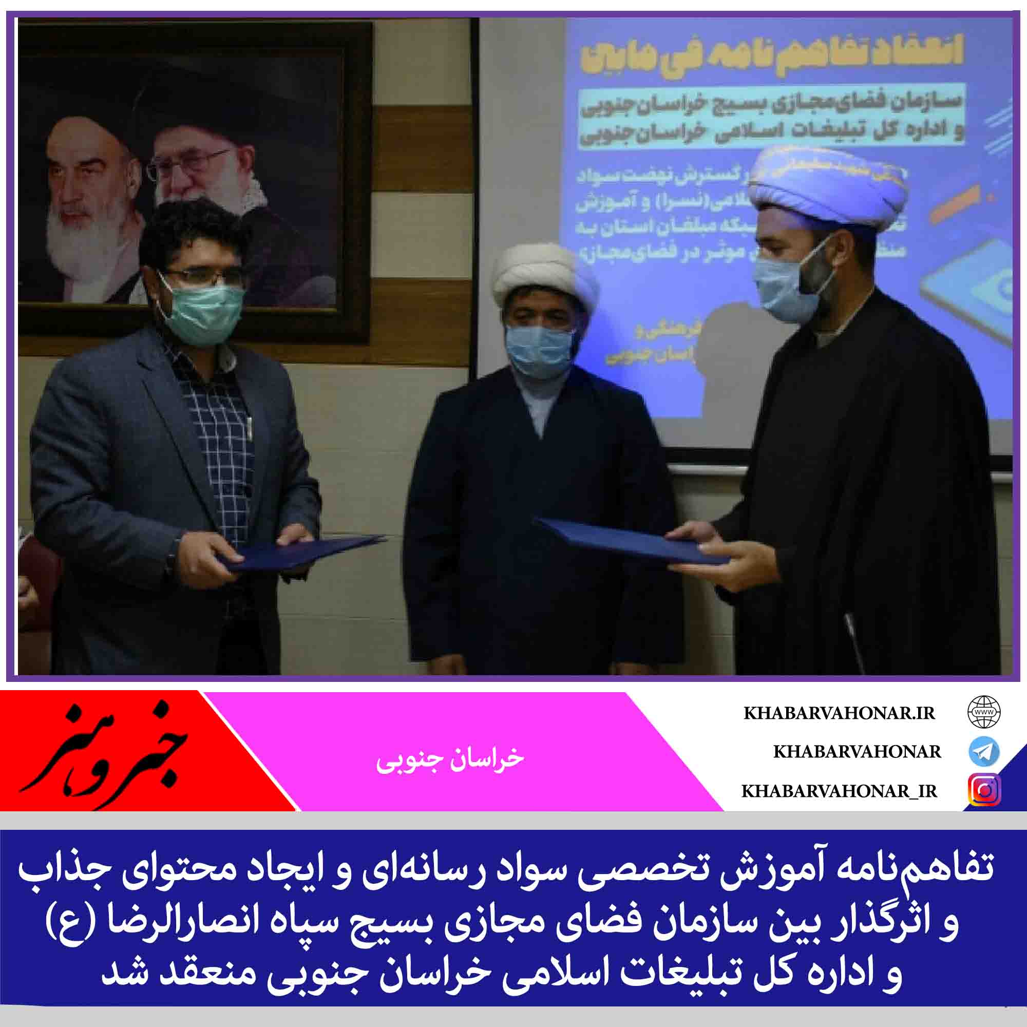 تفاهمنامه آموزش تخصصی سواد رسانهای و ایجاد محتوای جذاب و اثرگذار بین سازمان فضای مجازی بسیج سپاه انصارالرضا (ع) و اداره کل تبلیغات اسلامی خراسان جنوبی منعقد شد.