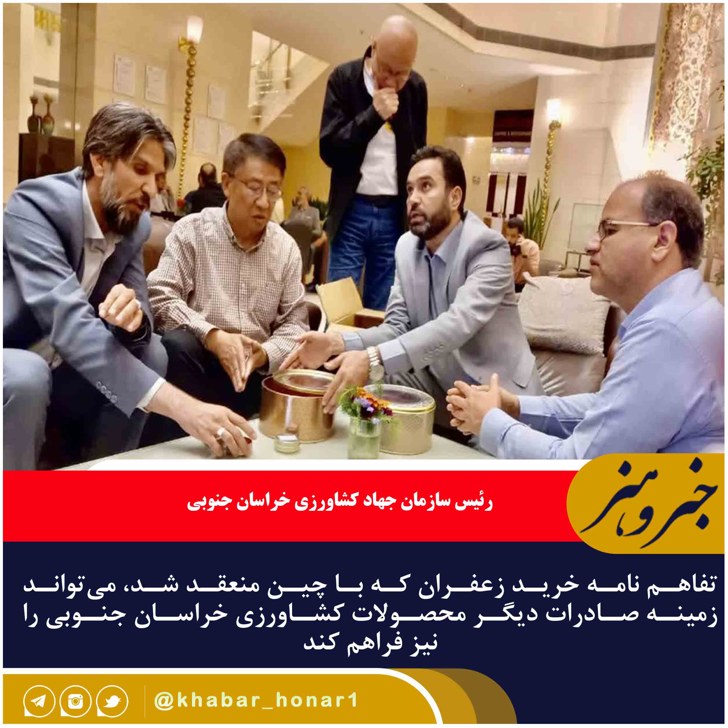 ▪️وی گفت: نمونههایی از زعفرانهایی که در قالب خرید توافقی و تضمینی از کشاورزان خریداری شده بود، به تجار چین تحویل شد.رئیس سازمان جهاد کشاورزی خراسان جنوبی با اشاره به اینکه این تفاهم نامه میتواند به ایجاد ارزش افزوده در زعفران استان منجر شود، گفت: انعقاد این تفاهم نامه میتواند زمینه صادرات دیگر محصولات کشاورزی استان را نیز فراهم کند. وی گفت :زرشک، زعفران، عناب، پنبه مله، شتر، شترمرغ، عسل، آنغوزه شیرین تنها بخشی از پتانسیلهای کشاورزی خراسان جنوبی است.