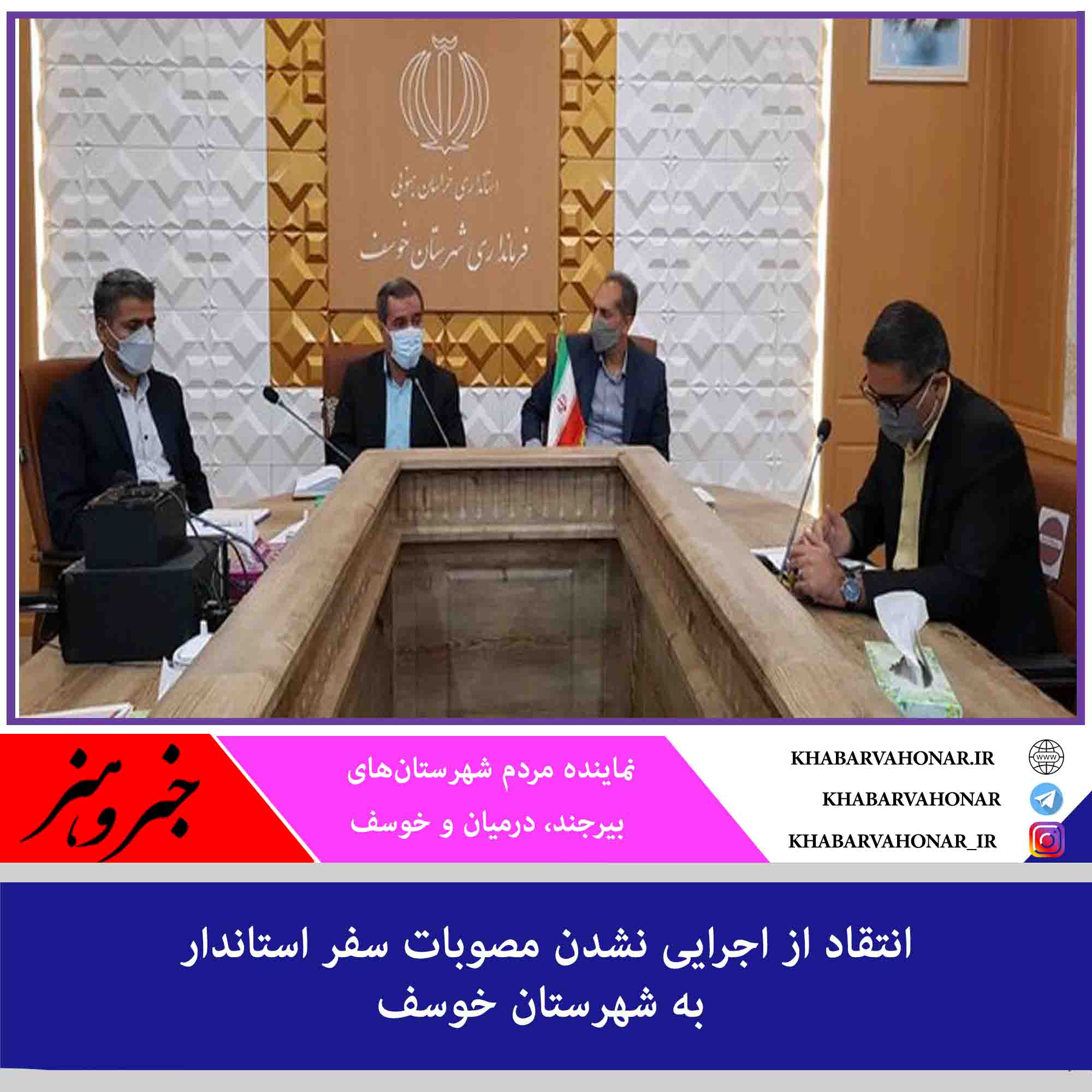 نماینده مردم شهرستانهای بیرجند، درمیان و خوسف با انتقاد از اجرایی نشدن مصوبات سفر استاندار به شهرستان خوسف، گفت: در راستای رفع مشکلات زیرساختی و بنگاههای اقتصادی مصوبات بسیار خوبی داشتیم که متاسفانه بسیاری از آنها اجرایی نشده است.