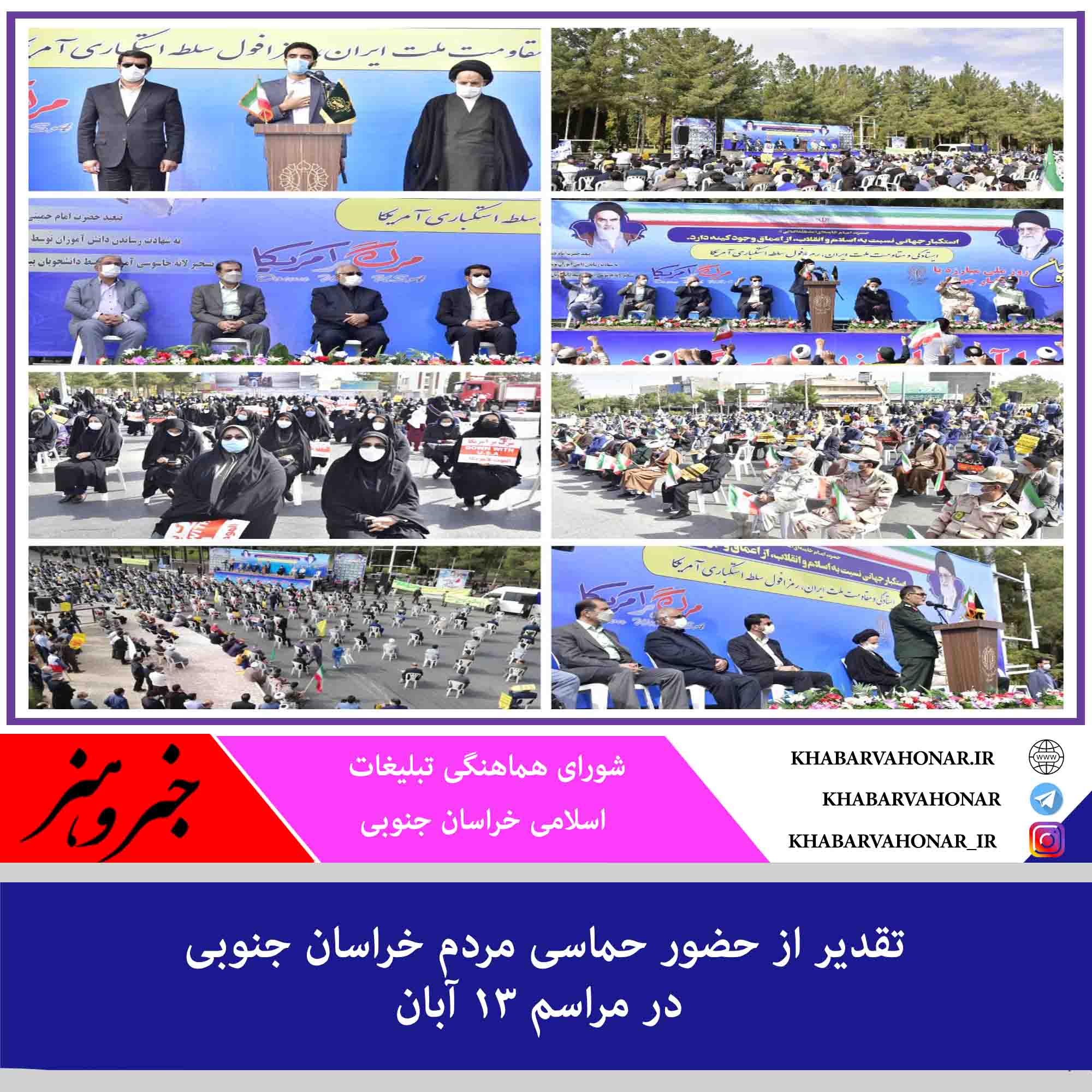 حضور دشمنشکن، گسترده و هوشمندانۀ اقشار مختلف مردم شریف بویژه جوانان و نوجوانان غیور و ظلم ستیز خراسان جنوبی در اجتماعات باشکوه یومالله ۱۳ آبان، روز ملی مبارزه با استکبار جهانی” در شرایط خاص ناشی از شیوع ویروس منحوس کرونا، نشان دهنده نفرت مقدس مردم انقلابی نسبت به استکبارجهانی و مصداق اتم آن، امریکای جنایت پیشه بود که با غریوهای کوبنده “مرگ بر آمریکا”، انزجار خویش از استکبار جهانی را به گوش جهانیان، سادهلوحان و مرعوبین رساندند و با خلق حماسهای تاریخی، برگ زرین دیگری بر اوراق سراسر مباهات نظام مقدس دینی افزودند.