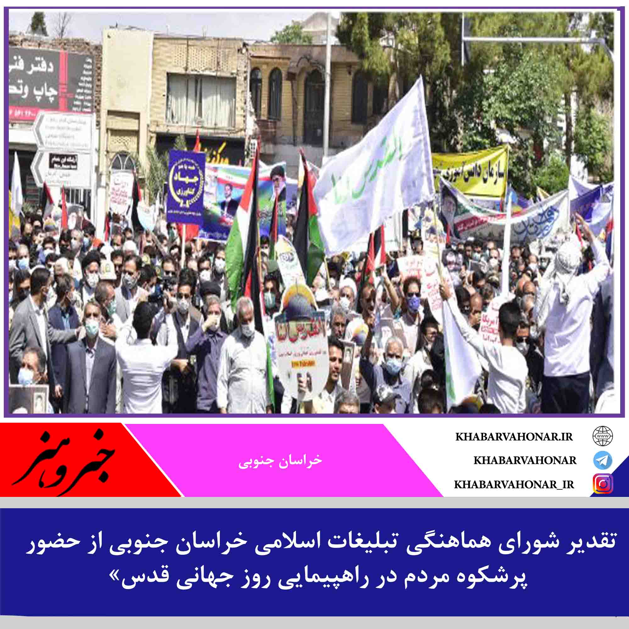 مردم مومن و روزه دار خراسان جنوبی، با حضور پرشور و آگاهانه خویش در راهپیمایی روز جهانی قدس، حماسهای جاودان و ماندگار به یادگار گذاشتند و برگ زرین دیگری در دفتر قطور خاطرات و افتخارات استان ثبت و ضبط کردند و با گوشجان به پیام تاریخی حضرت امام خمینی(ره) و ندای حقطلبی حضرت امام خامنه ای (مدظلّهالعالی) ، در حمایت از فلسطین، این پارهتن اسلام، لبیکگویان در راهپیمایی روز جهانی قدس، حضوری آگاهانه، ارزشمند و انقلابی یافتند.