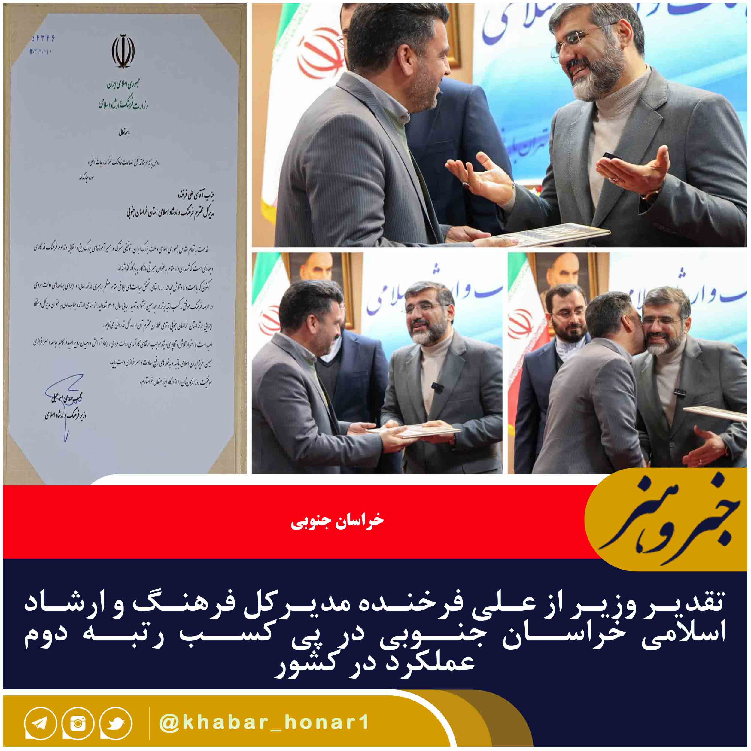 محمدمهدی اسماعیلی، وزیر فرهنگ و ارشاد اسلامی با اهدای لوح تقدیر به علی فرخنده؛ مدیر کل فرهنگ و ارشاد اسلامی خراسان جنوبی در پی کسب رتبه برتر در هجدهمین جشنواره شهید رجایی سال ۱۴۰۲ تقدیر و تشکر کرد. خراسان جنوبی، طی مراسمی با حضور محمدمهدی اسماعیلی؛ وزیر فرهنگ و ارشاد اسلامی، از علی فرخنده، مدیرکل فرهنگ و ارشاد اسلامی خراسان جنوبی به عنوان دستگاه برتر در شاخصهای عمومی و اختصاصی «گروه فرهنگی، علمی و آموزشی جشنواره شهید رجایی» تقدیر شد.