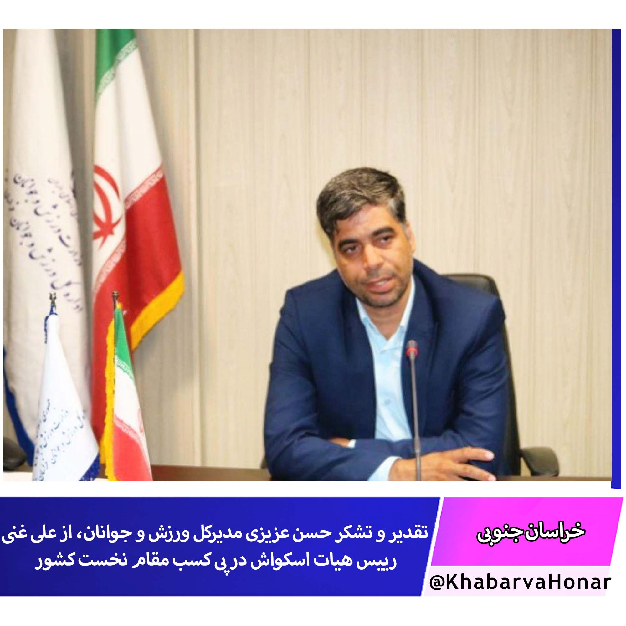 تقدیر و تشکر حسن عزیزی مدیرکل ورزش و جوانان، از علی غنی رییس هیات اسکواش در پی کسب مقام نخست کشور
