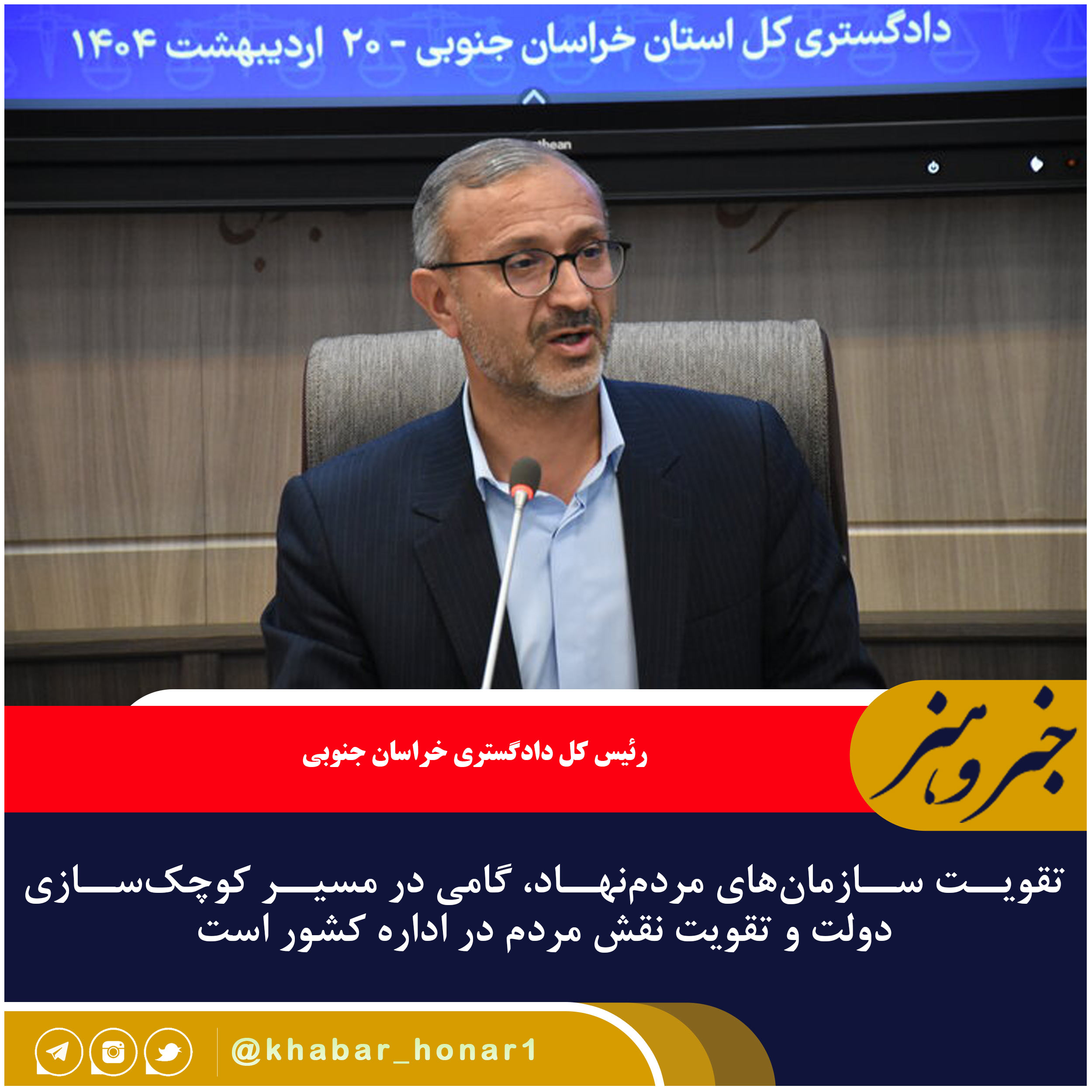 رئیس کل دادگستری خراسان جنوبی با تأکید بر اینکه هدف از تقویت نهادهای مردمی، افزایش ظرفیتهای نظام اجتماعی است، افزود: این نهادها با انتخاب مسیر مشارکت اجتماعی، به تقویت سرمایهای میپردازند که امام خمینی (ره) و مقام معظم رهبری بارها بر نقش آن در پیشبرد اهداف انقلاب تأکید کردهاند.