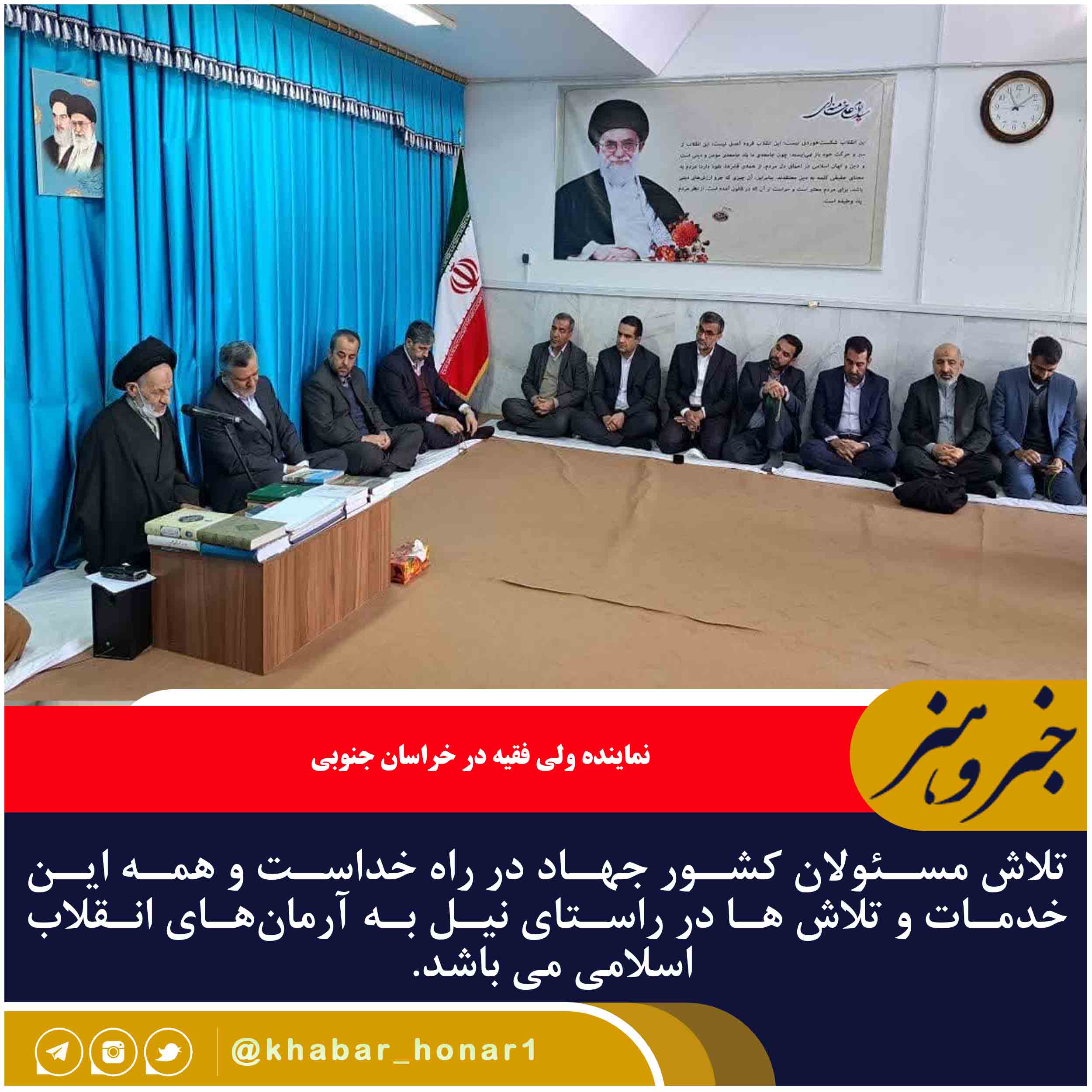 ?نماینده ولی فقیه در خراسان جنوبی و امام جمعه بیرجند گفت: تلاش مسئولان کشور جهاد در راه خداست و همه این خدمات و تلاش ها در راستای نیل به آرمانهای انقلاب اسلامی می باشد.