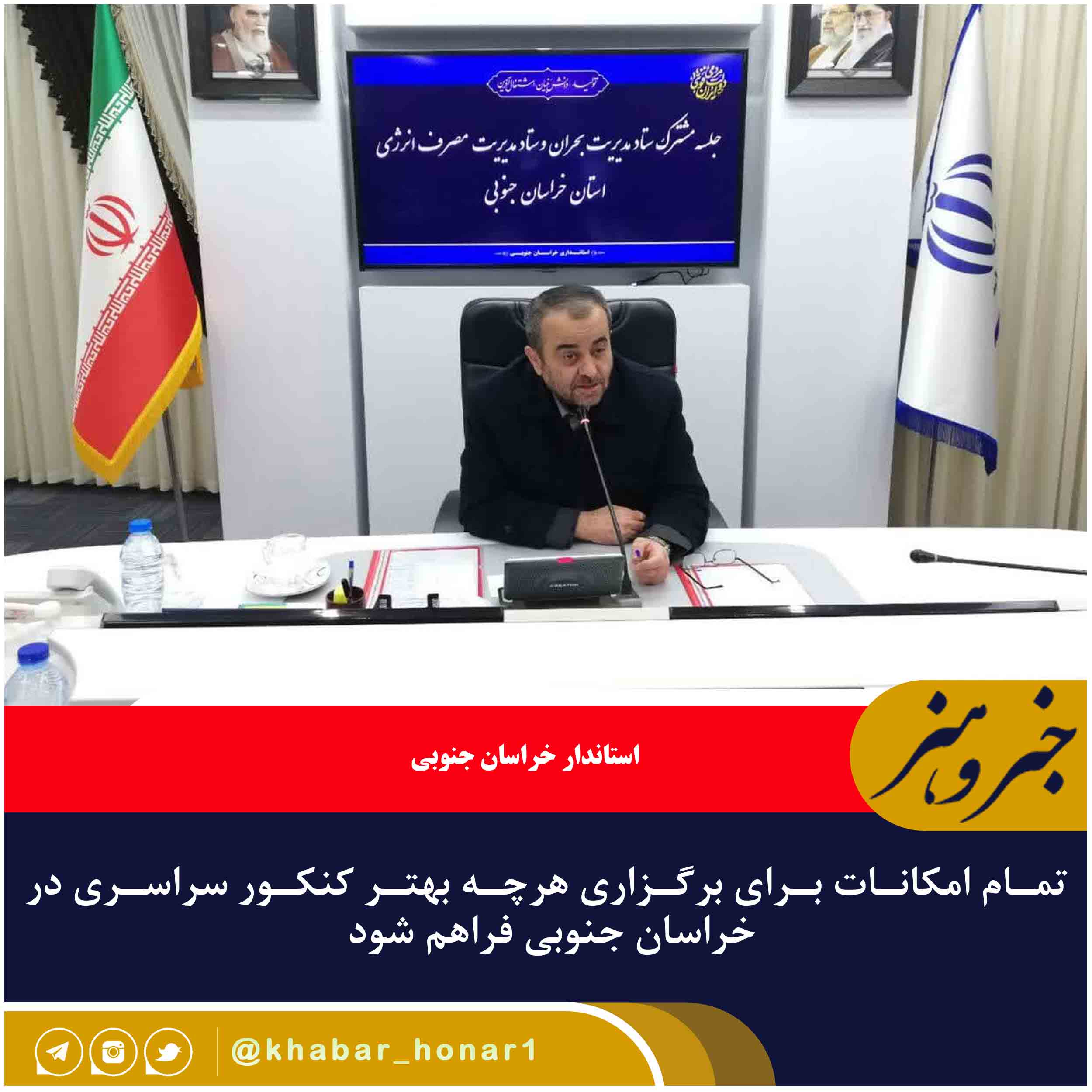 ?استاندار خراسان جنوبی درخصوص برگزاری کنکور سراسری در آخر هفته در استان گفت: مدیران تمام تلاش خود را برای برگزاری کنکور در محیطی آرام و گرم و حتی بهتر از سال قبل برای فرزندان مان داشته باشند تا داوطلبان با آرامش آزمون بدهند.