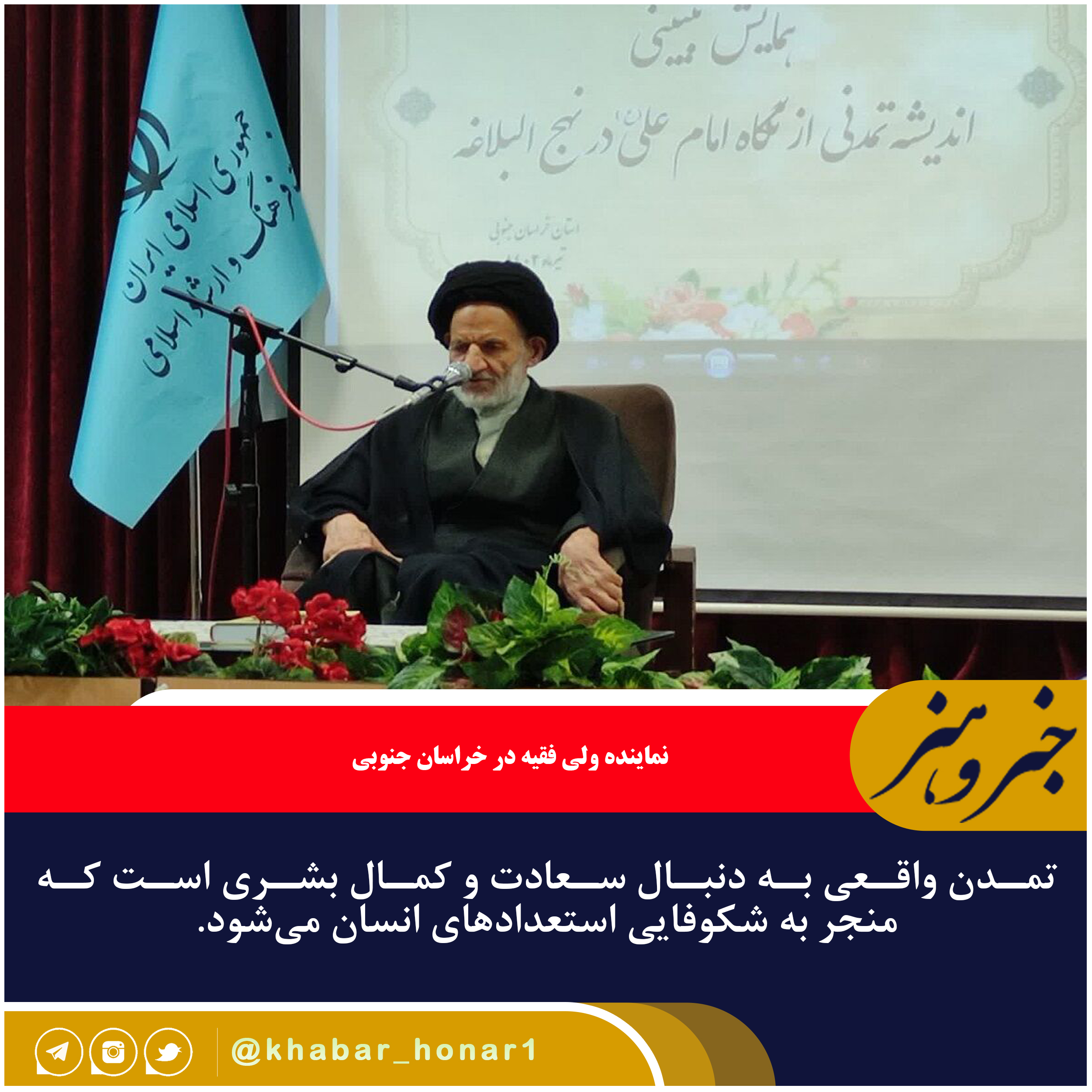 نماینده ولی فقیه در خراسان جنوبی و امام جمعه بیرجند گفت: تمدن واقعی به دنبال سعادت و کمال بشری است که منجر به شکوفایی استعدادهای انسان میشود.