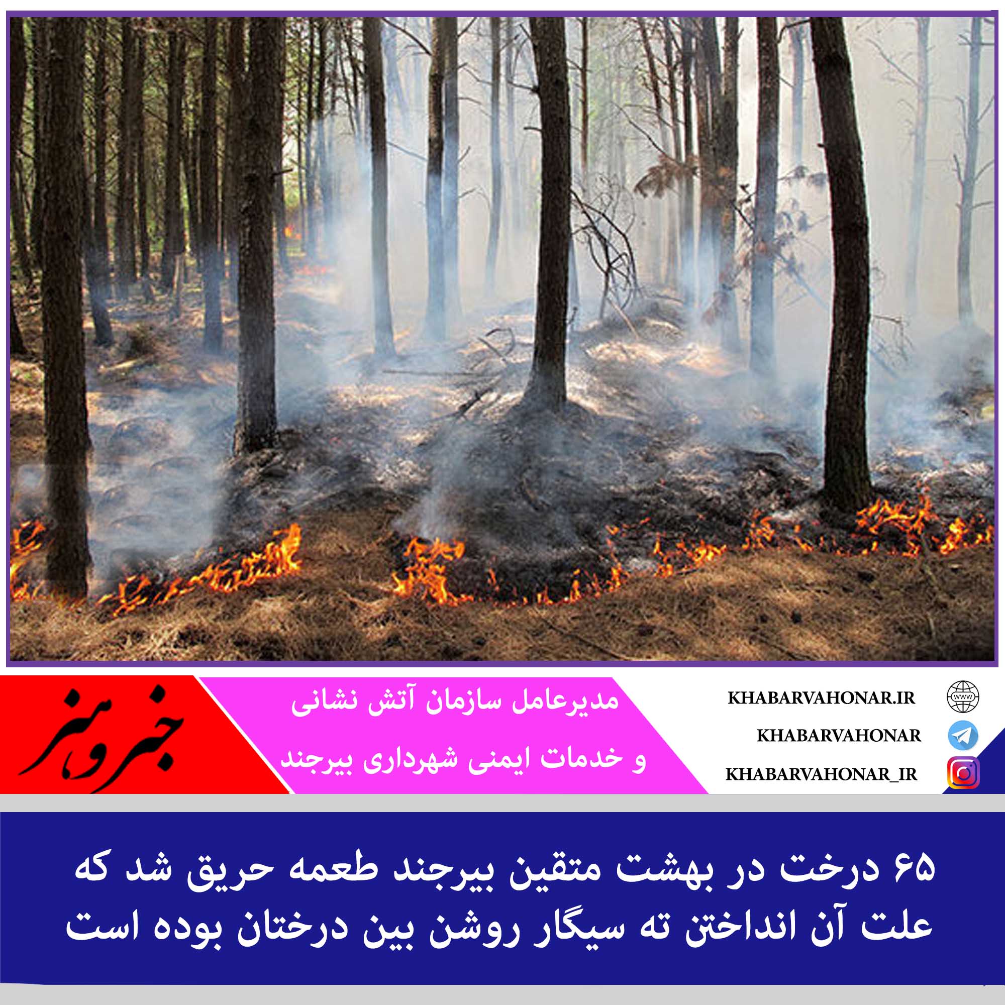 مدیرعامل سازمان آتش نشانی و خدمات ایمنی شهرداری بیرجند گفت: ۶۵ درخت در بهشت متقین بیرجند طعمه حریق شد که علت آن انداختن ته سیگار روشن بین درختان بود.