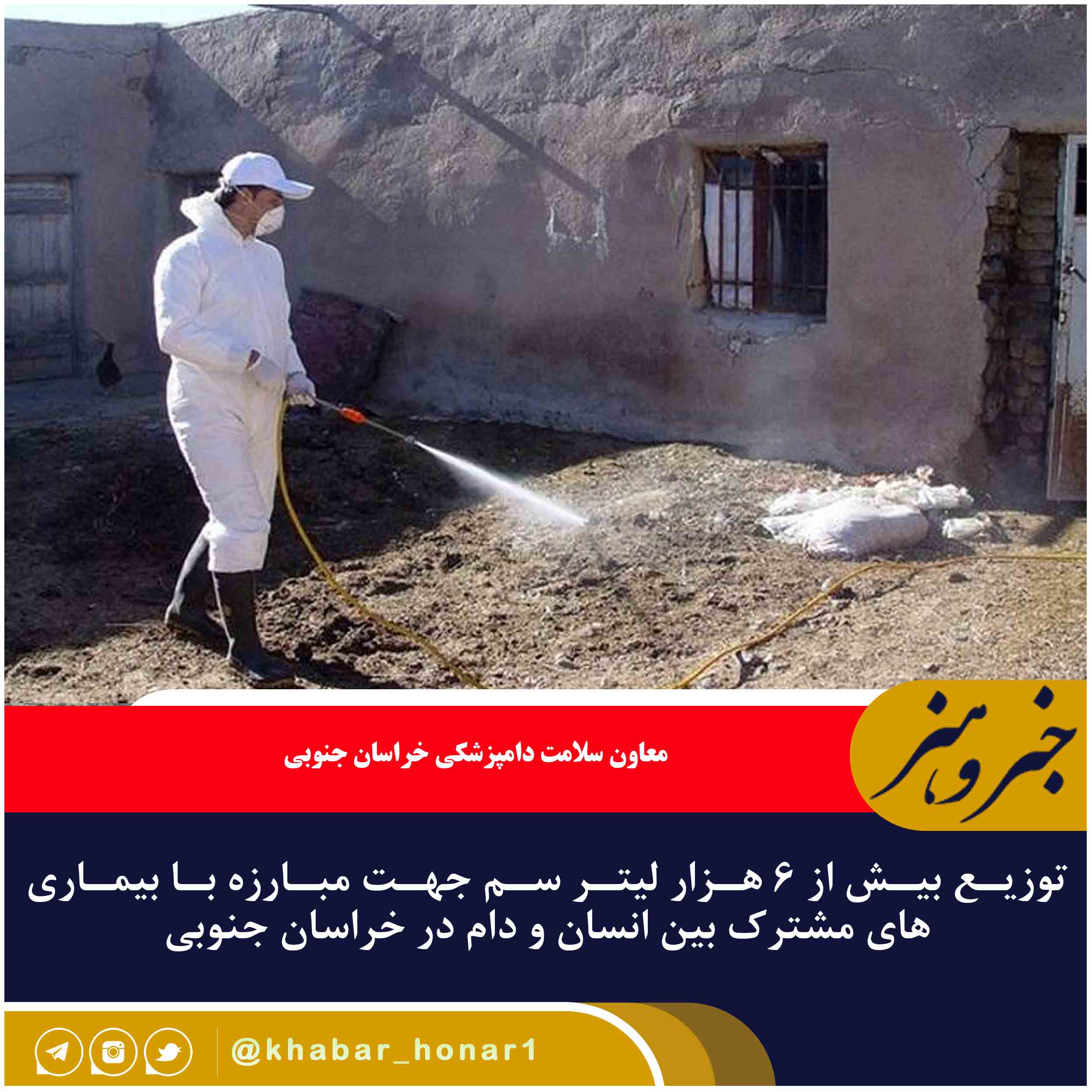 معاون سلامت دامپزشکی خراسان جنوبی گفت: از ابتدای امسال بیش از ۶ هزار لیتر سم به منظور مبارزه با بیماری‌های قابل انتقال بین انسان و دام توزیع شده است.