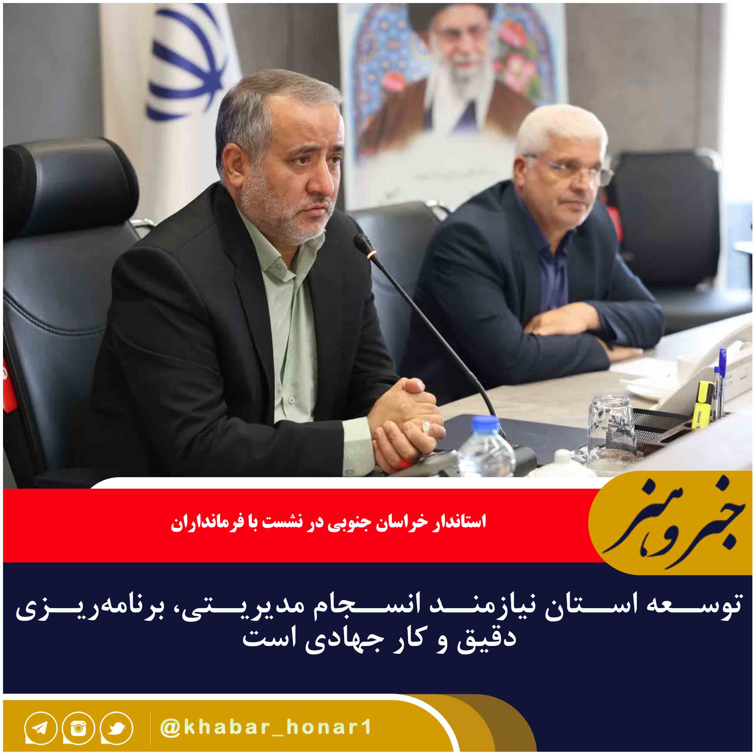 🔹استاندار خراسان جنوبی در نشست با فرمانداران تأکید کرد: مهمترین وظیفه فرمانداران، حضور میدانی، پاسخگویی مؤثر و پیشقدم بودن در رفع مشکلات مردم است.
