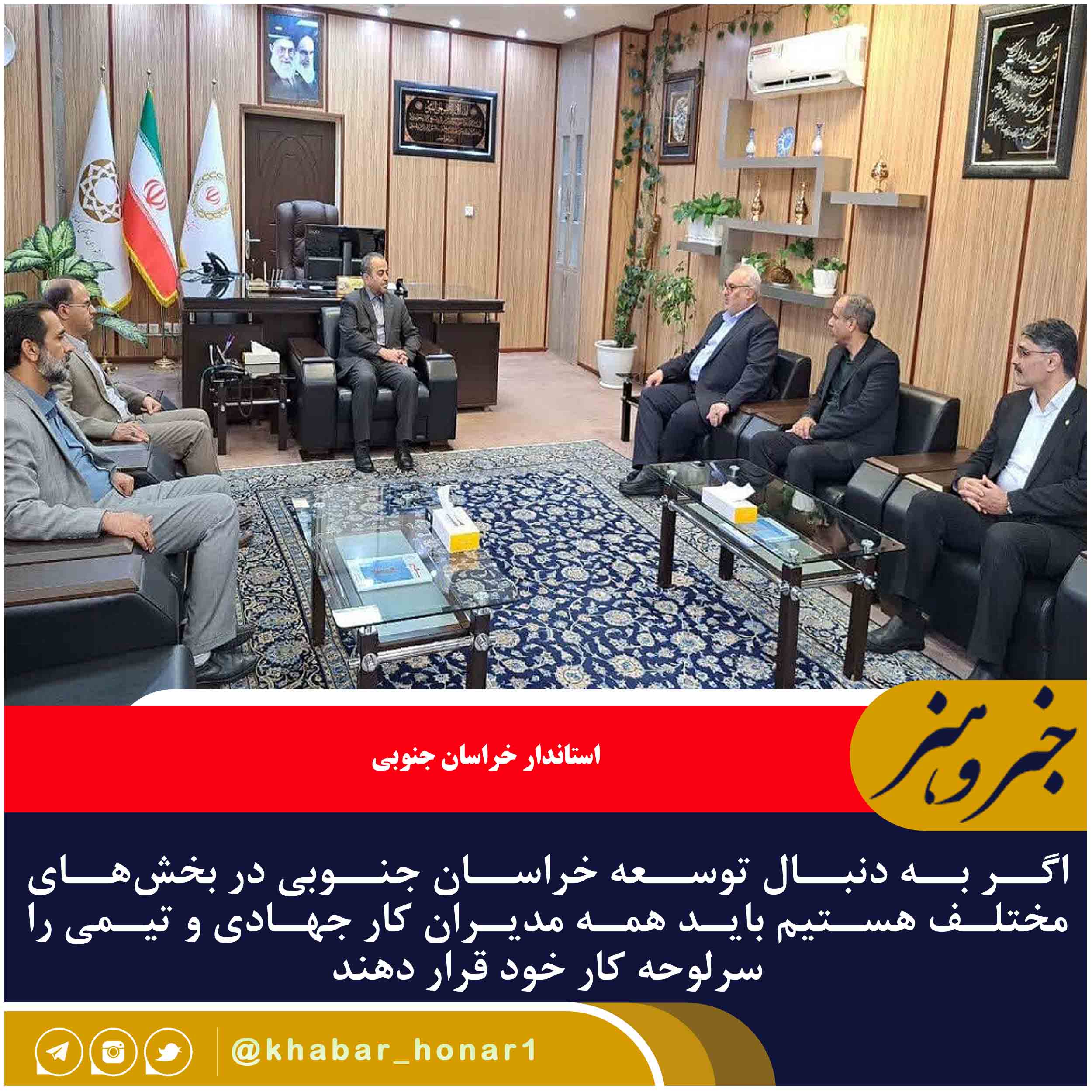 استاندار خراسان جنوبی گفت: اگر به دنبال توسعه خراسان جنوبی در بخشهای مختلف هستیم باید همه مدیران کار جهادی و تیمی را سرلوحه کار خود قرار دهند.