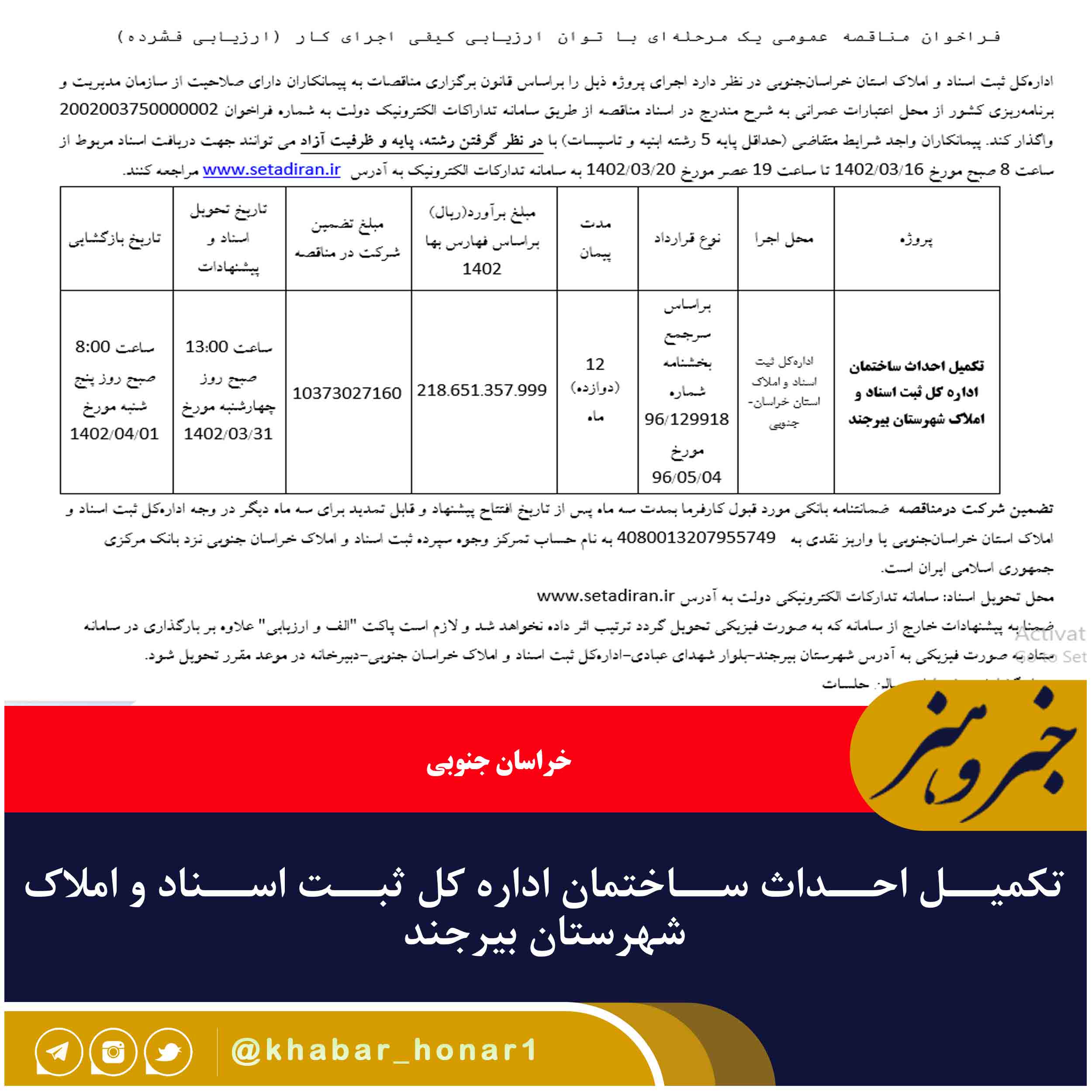 ادارهکل ثبت اسناد و املاک استان خراسانجنوبی در نظر دارد اجرای پروژه ذیل را براساس قانون برگزاری مناقصات به پیمانکاران دارای صلاحیت از سازمان مدیریت و برنامهریزی کشور از محل اعتبارات عمرانی به شرح مندرج در اسناد مناقصه از طریق سامانه تداراکات الکترونیک دولت به شماره فراخوان ۲۰۰۲۰۰۳۷۵۰۰۰۰۰۰۲ واگذار کند. پیمانکاران واجد شرایط متقاضی (حداقل پایه ۵ رشته ابنیه و تاسیسات) با در نظر گرفتن رشته، پایه و ظرفیت آزاد می توانند جهت دریافت اسناد مربوط از ساعت ۸ صبح مورخ ۱۶/۰۳/۱۴۰۲ تا ساعت ۱۹ عصر مورخ ۲۰/۰۳/۱۴۰۲ به سامانه تدارکات الکترونیک به آدرس www.setadiran.ir مراجعه کنند.