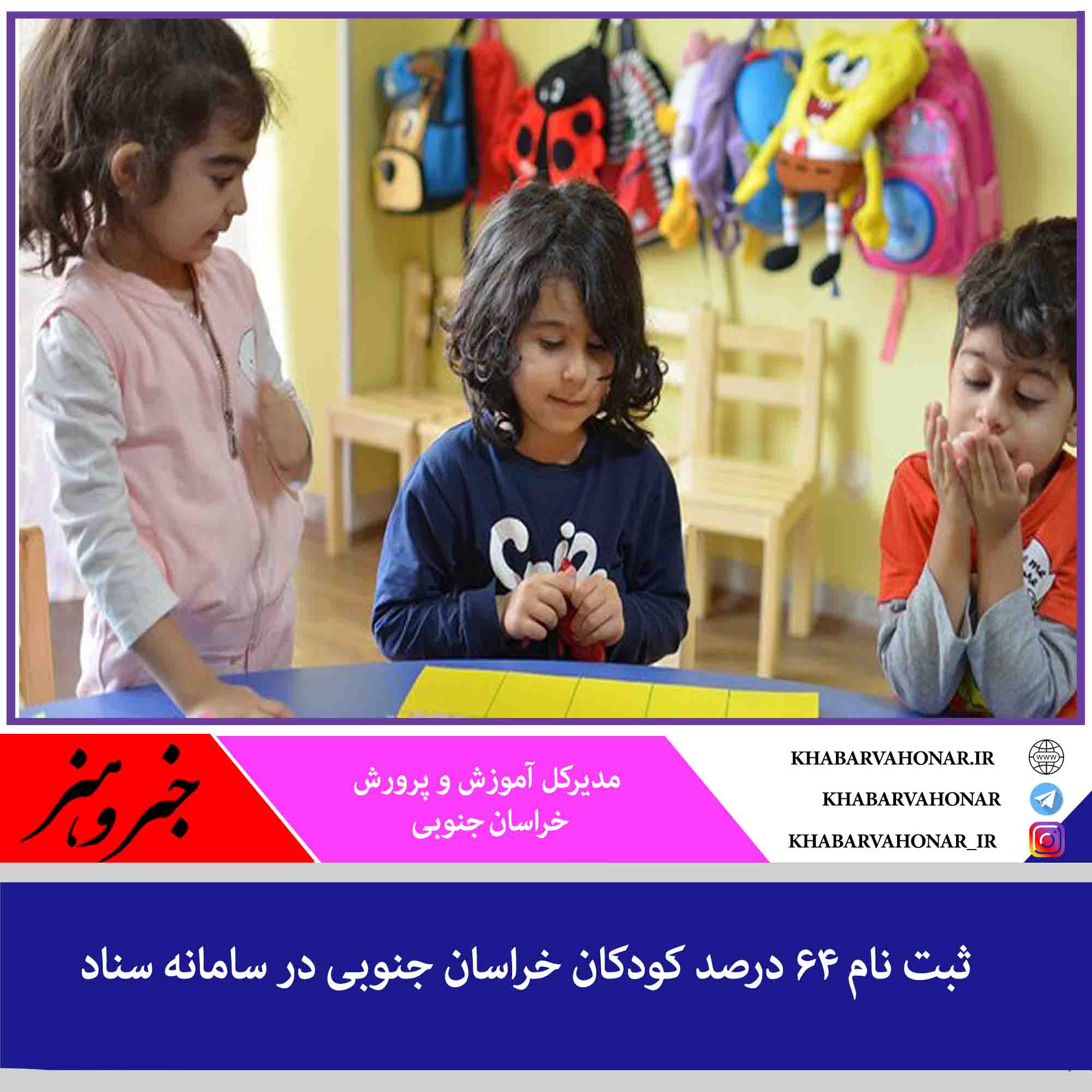 مدیرکل آموزش و پرورش خراسان جنوبی اظهار کرد: ۶۴ درصد کودکان دارای سن ۵ سال تمام خراسان جنوبی در سامانه سناد ثبت نام کردند.
