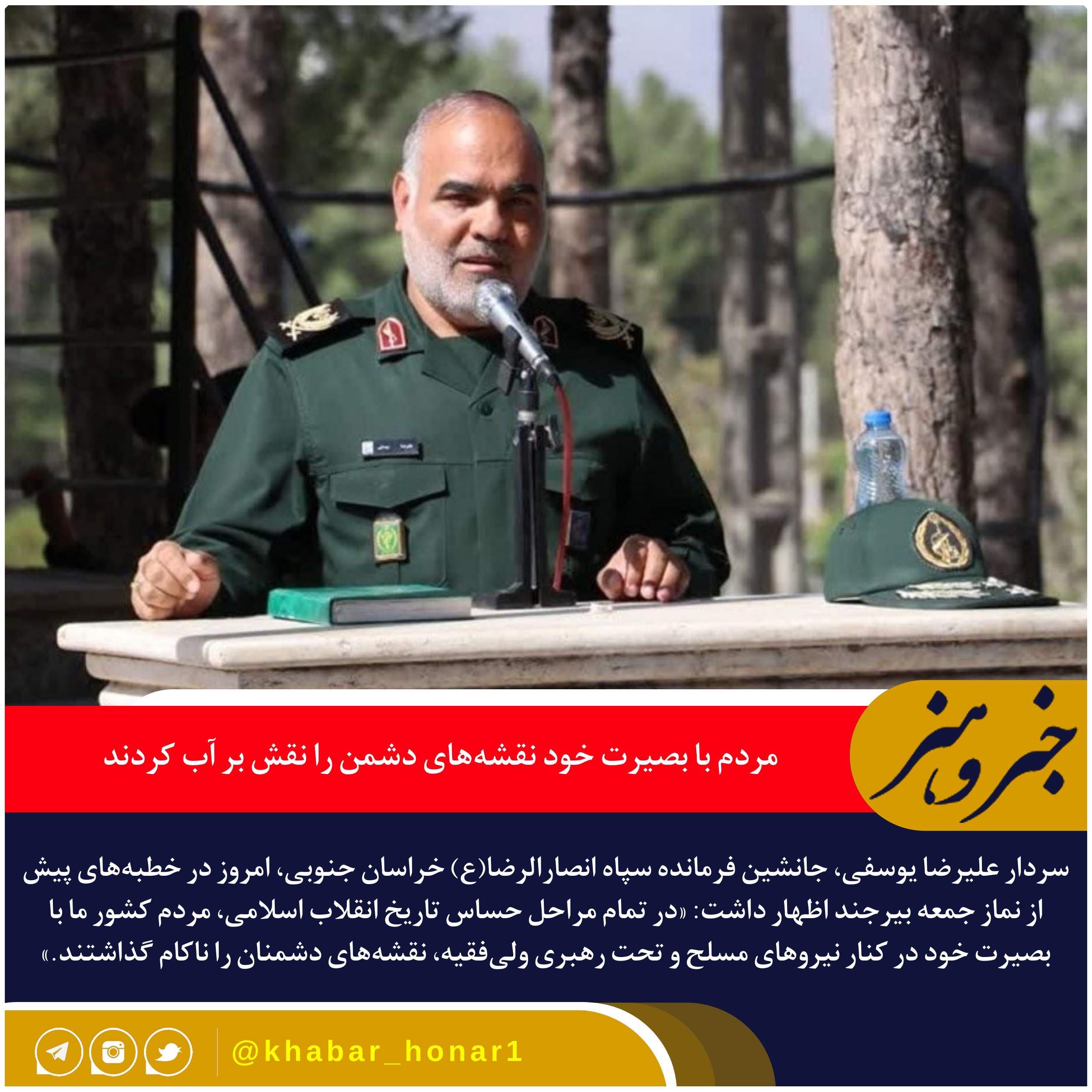 به گزارش خبر و هنر، سردار علیرضا یوسفی، جانشین فرمانده سپاه انصارالرضا(ع) خراسان جنوبی، امروز در خطبههای پیش از نماز جمعه بیرجند اظهار داشت: «در تمام مراحل حساس تاریخ انقلاب اسلامی، مردم کشور ما با بصیرت خود در کنار نیروهای مسلح و تحت رهبری ولیفقیه، نقشههای دشمنان را ناکام گذاشتند.»