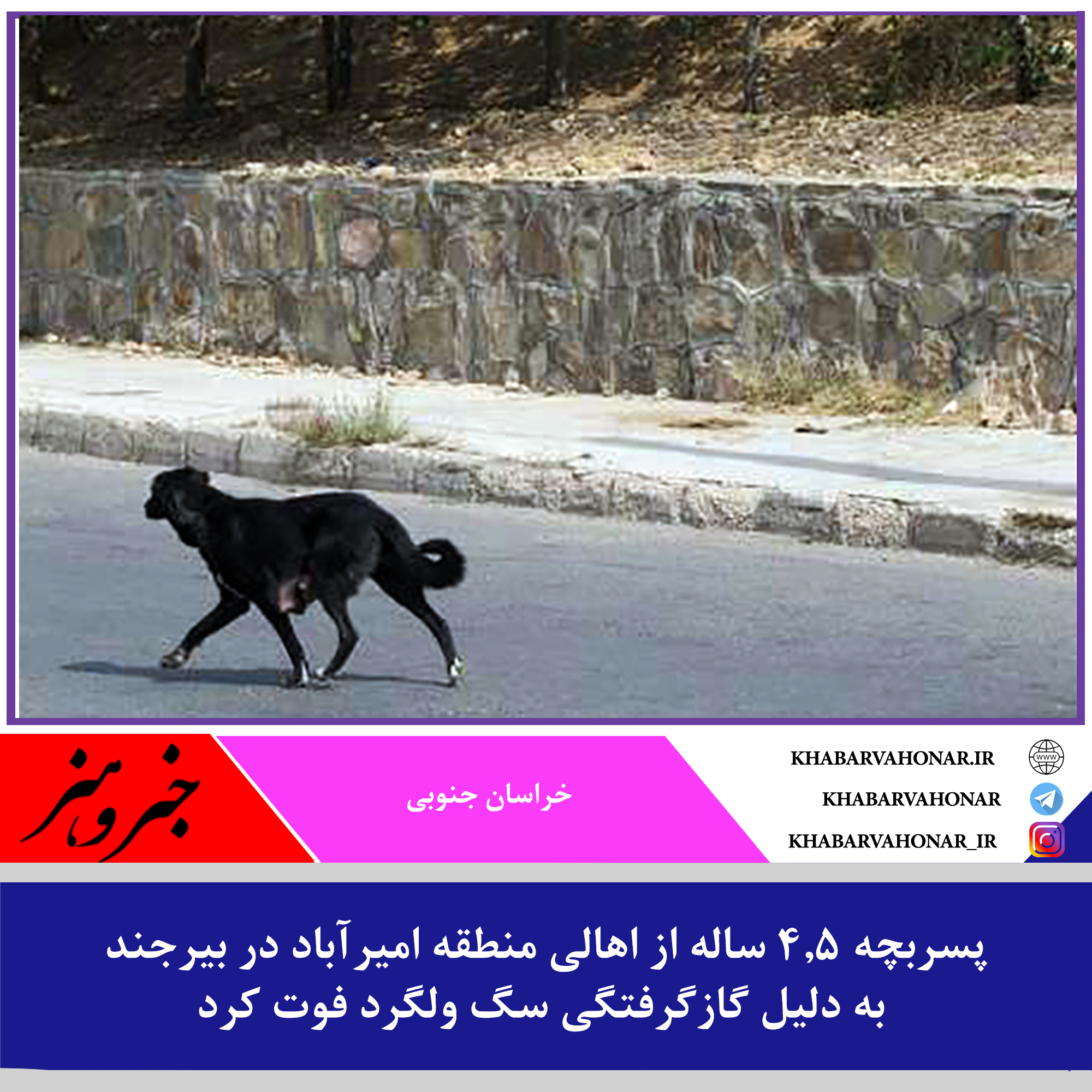 پسربچه ۴.۵ ساله از اهالی منطقه امیرآباد در بیرجند به دلیل گازگرفتگی سگ ولگرد فوت کرد.